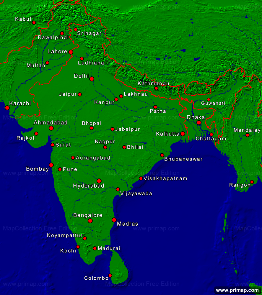Länderkarten - Indien - Städte + Grenzen - 887x1000 kleine Schrift