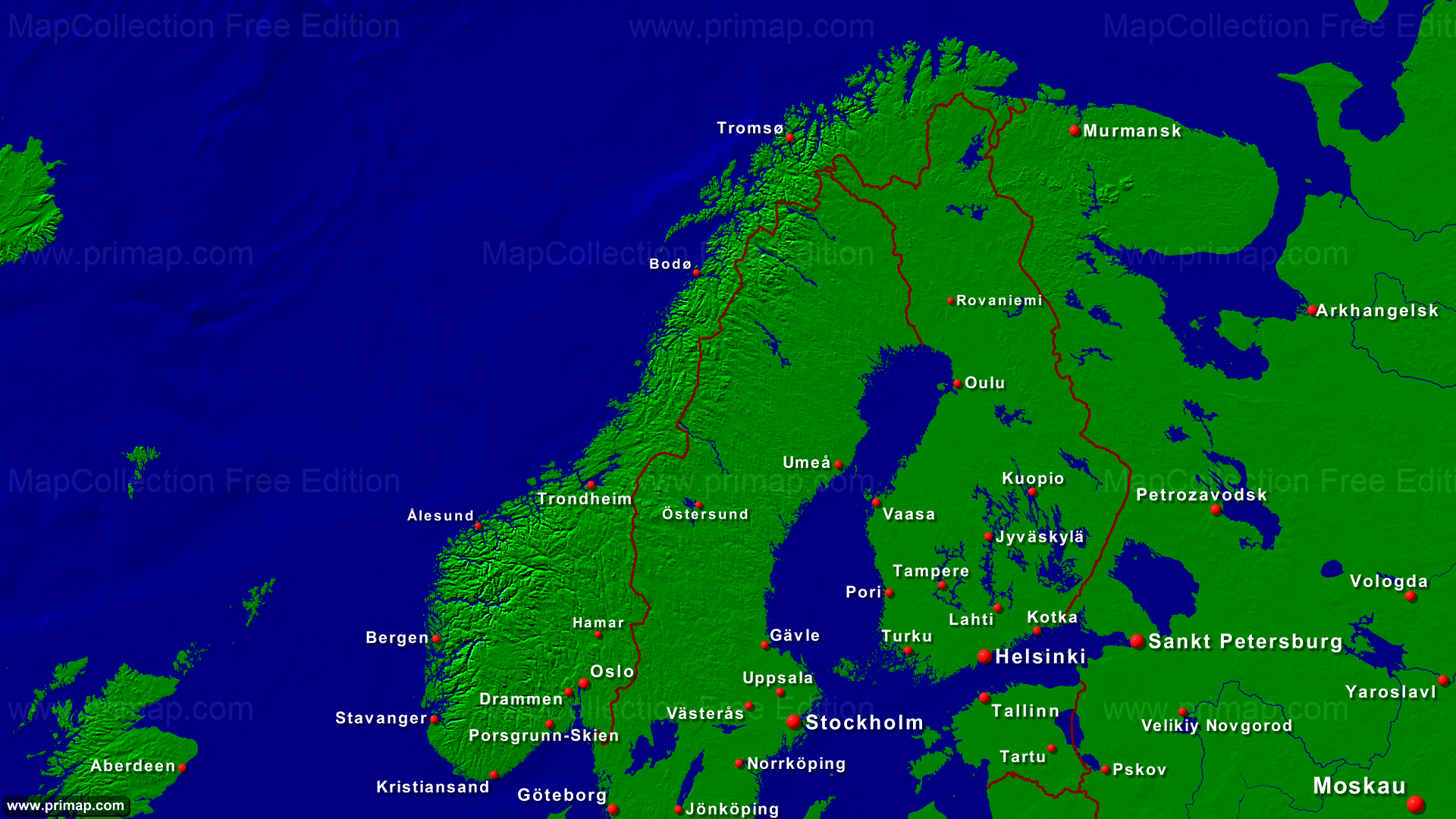 Länderkarten - Norwegen - Städte + Grenzen - 1920x1080 (16:9) große Schrift