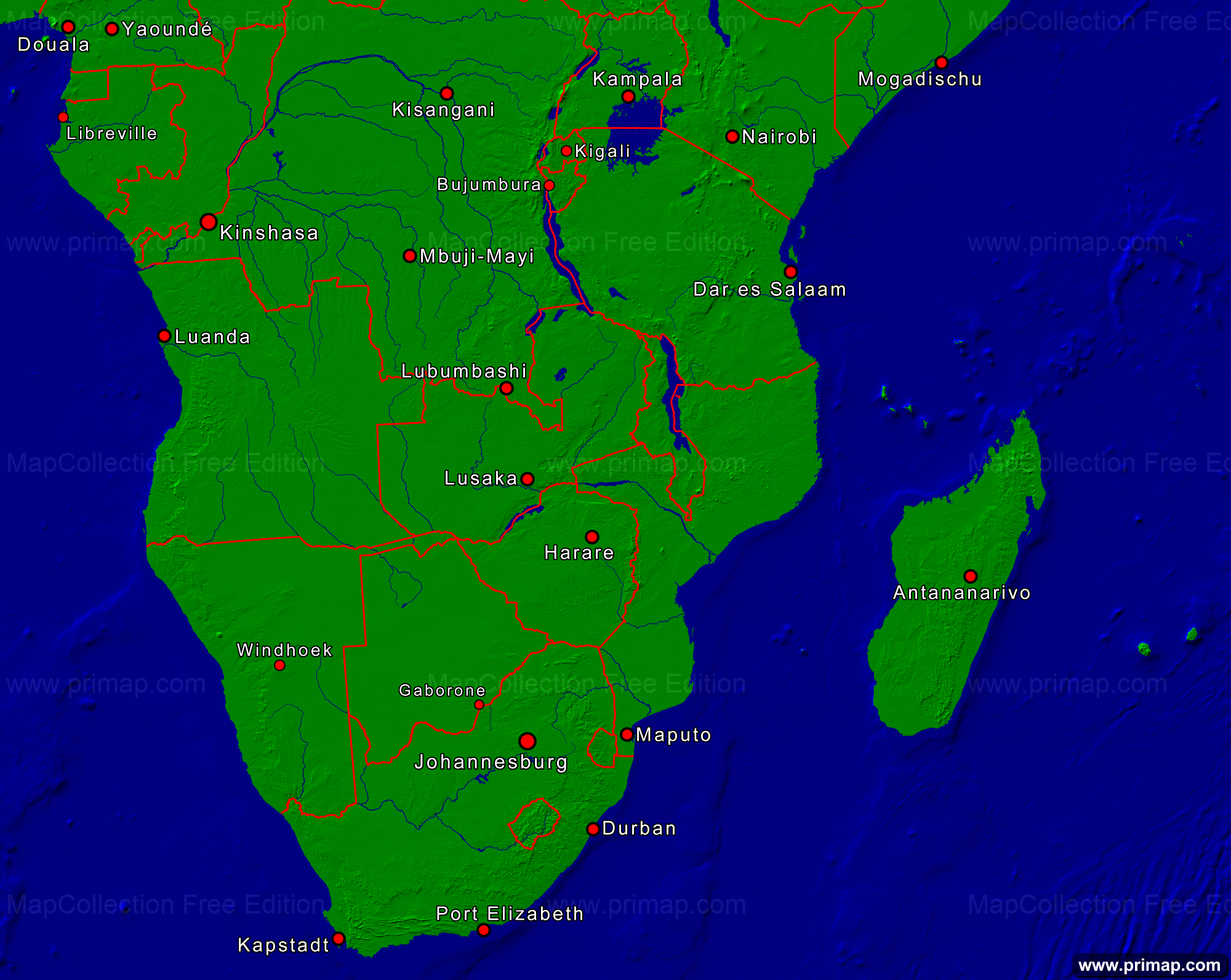 Kontinentalkarten - Afrika-Süd - Städte + Grenzen - 2000x1593 kleine Schrift
