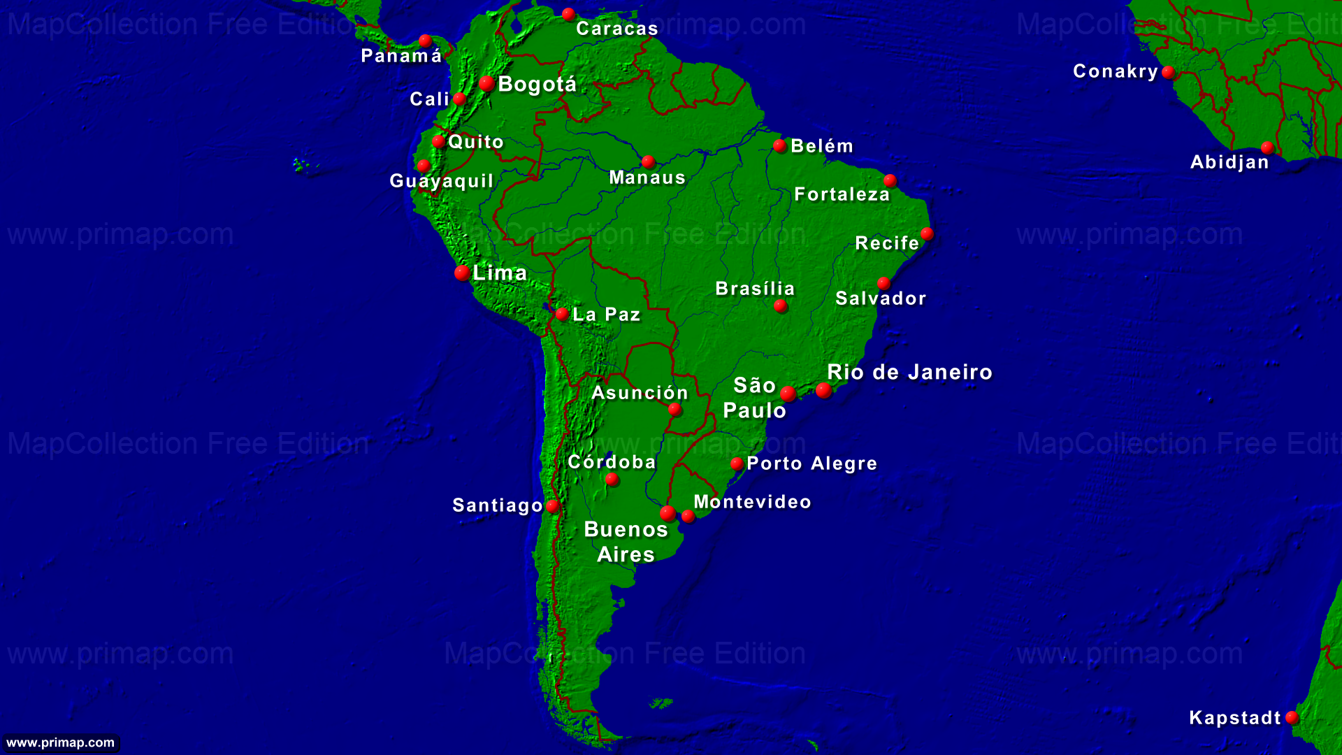 Kontinentalkarten - Amerika-Süd - Städte + Grenzen - 1920x1080 (16:9) große Schrift