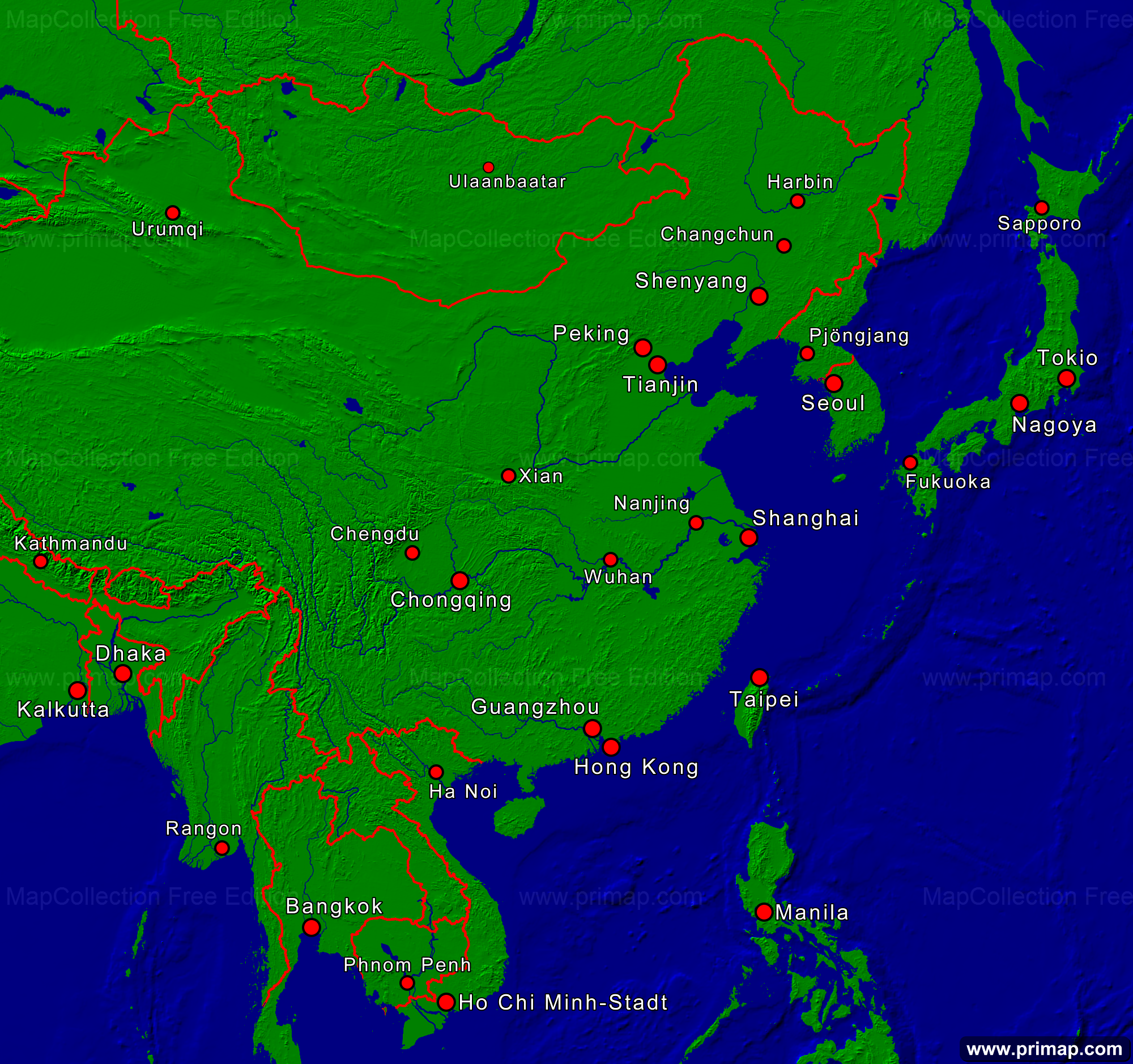 Kontinentalkarten - Asien-Ost - Städte + Grenzen - 2000x1878 kleine Schrift
