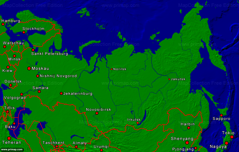 Kontinentalkarten - Asien-Nord - Städte + Grenzen - 1000x637 kleine Schrift