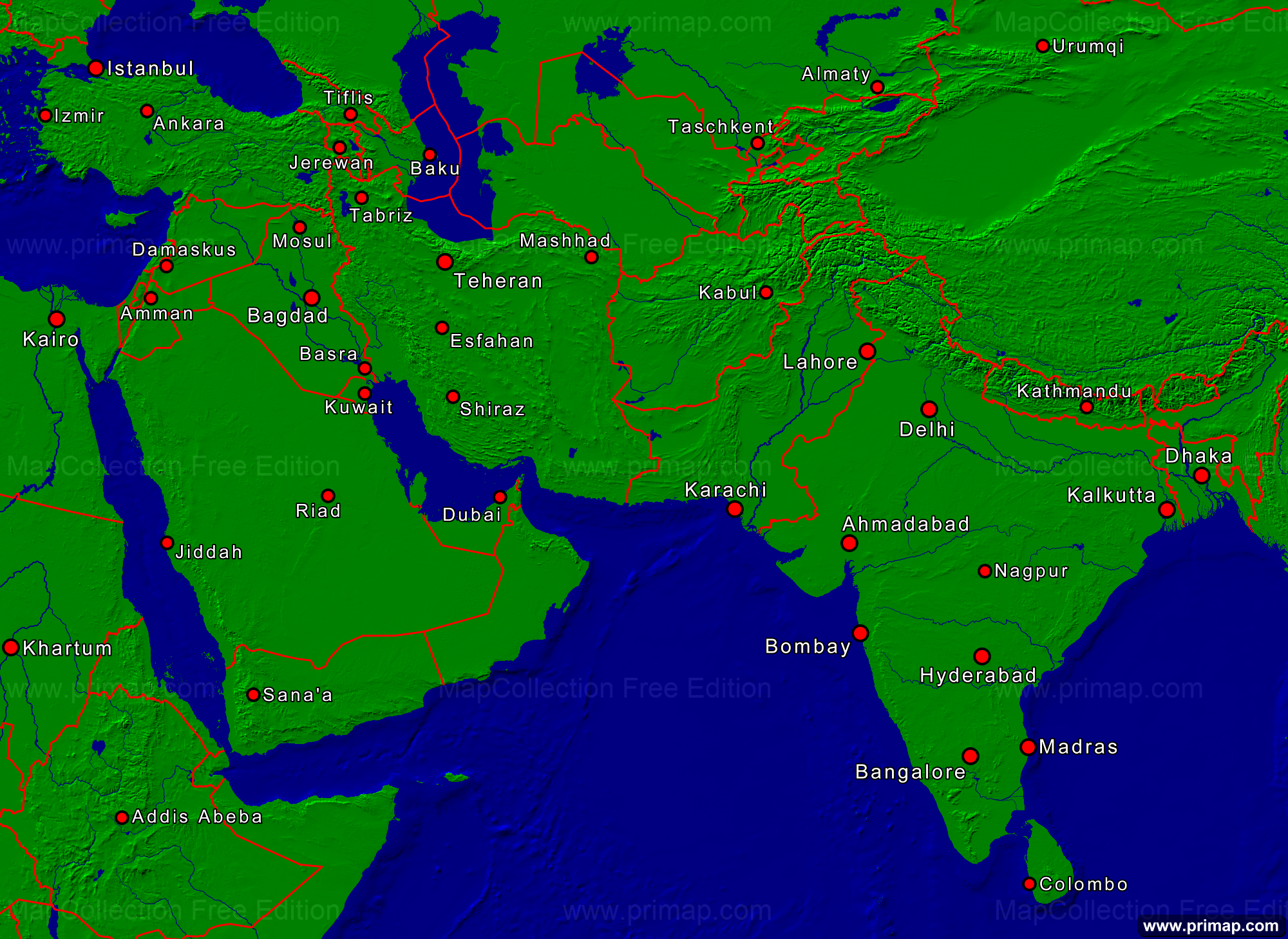 Kontinentalkarten - Asien-Südwest - Städte + Grenzen - 2000x1459 kleine Schrift