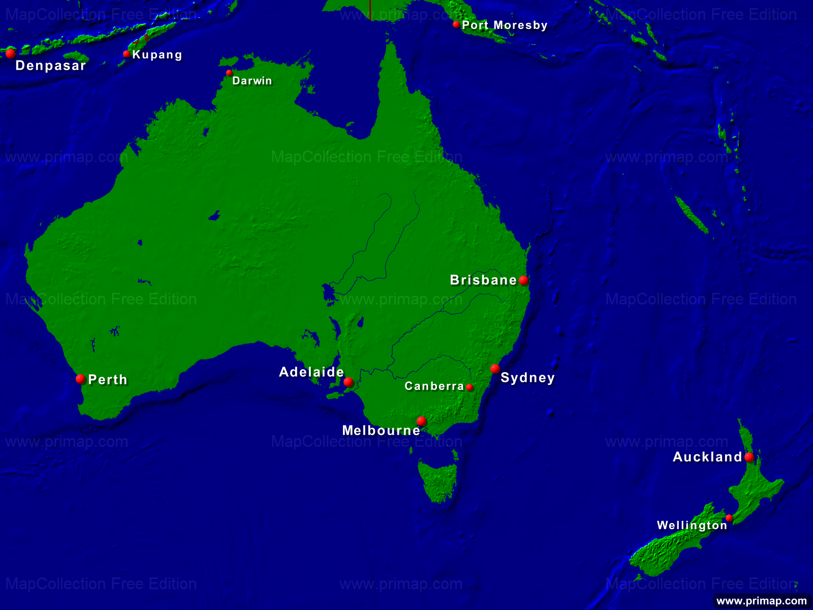 Kontinentalkarten - Australien-Neuseeland - Städte + Grenzen - 1600x1200 (4:3) große Schrift