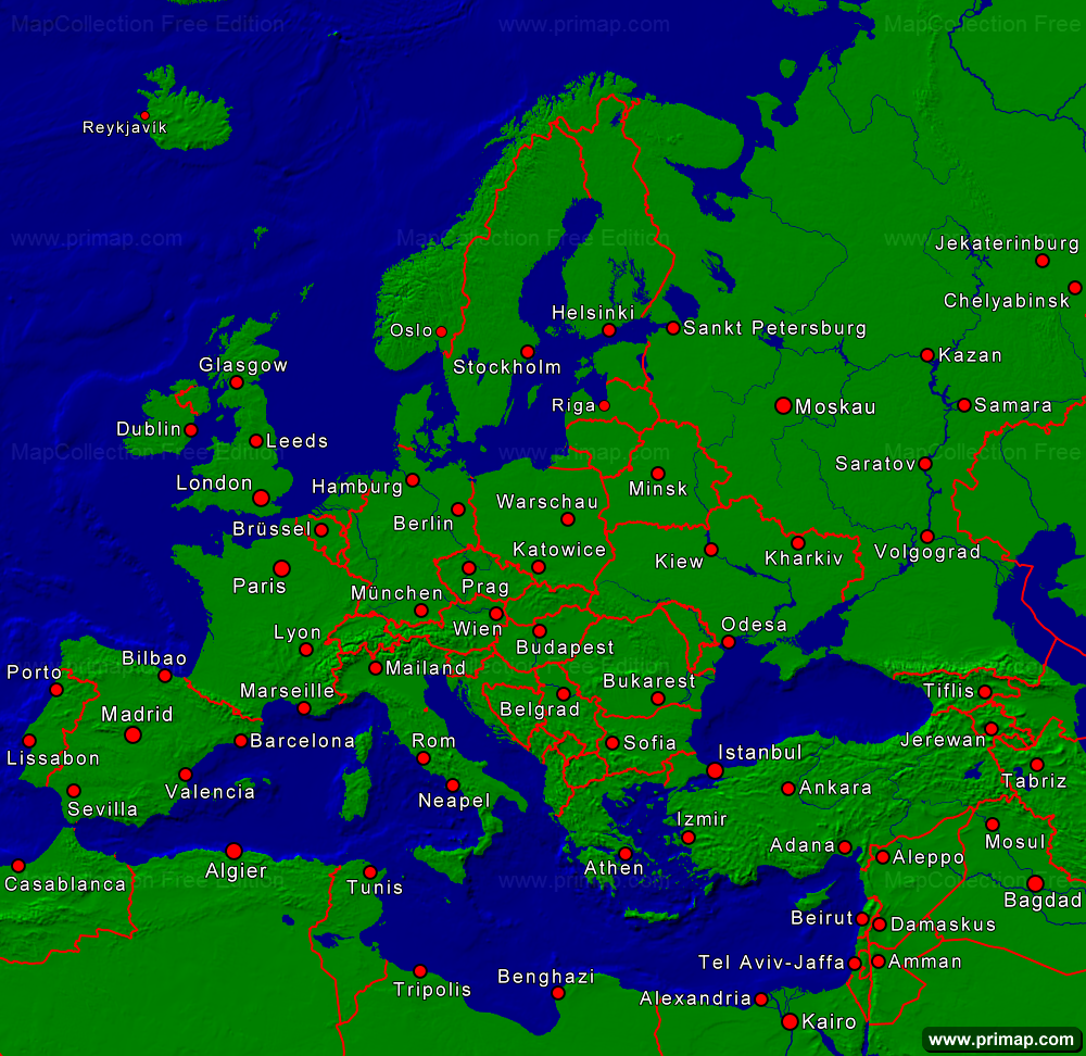 Kontinentalkarten - Europa (Typ 1) - Städte + Grenzen - 1000x972 kleine Schrift