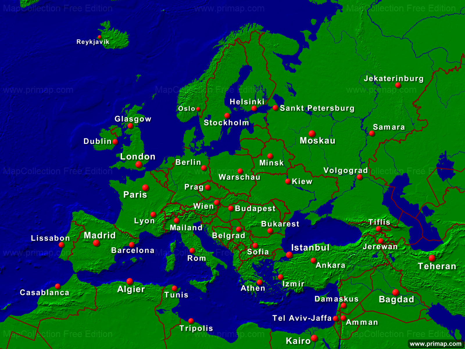 Kontinentalkarten - Europa (Typ 1) - Städte + Grenzen - 1600x1200 (4:3) große Schrift