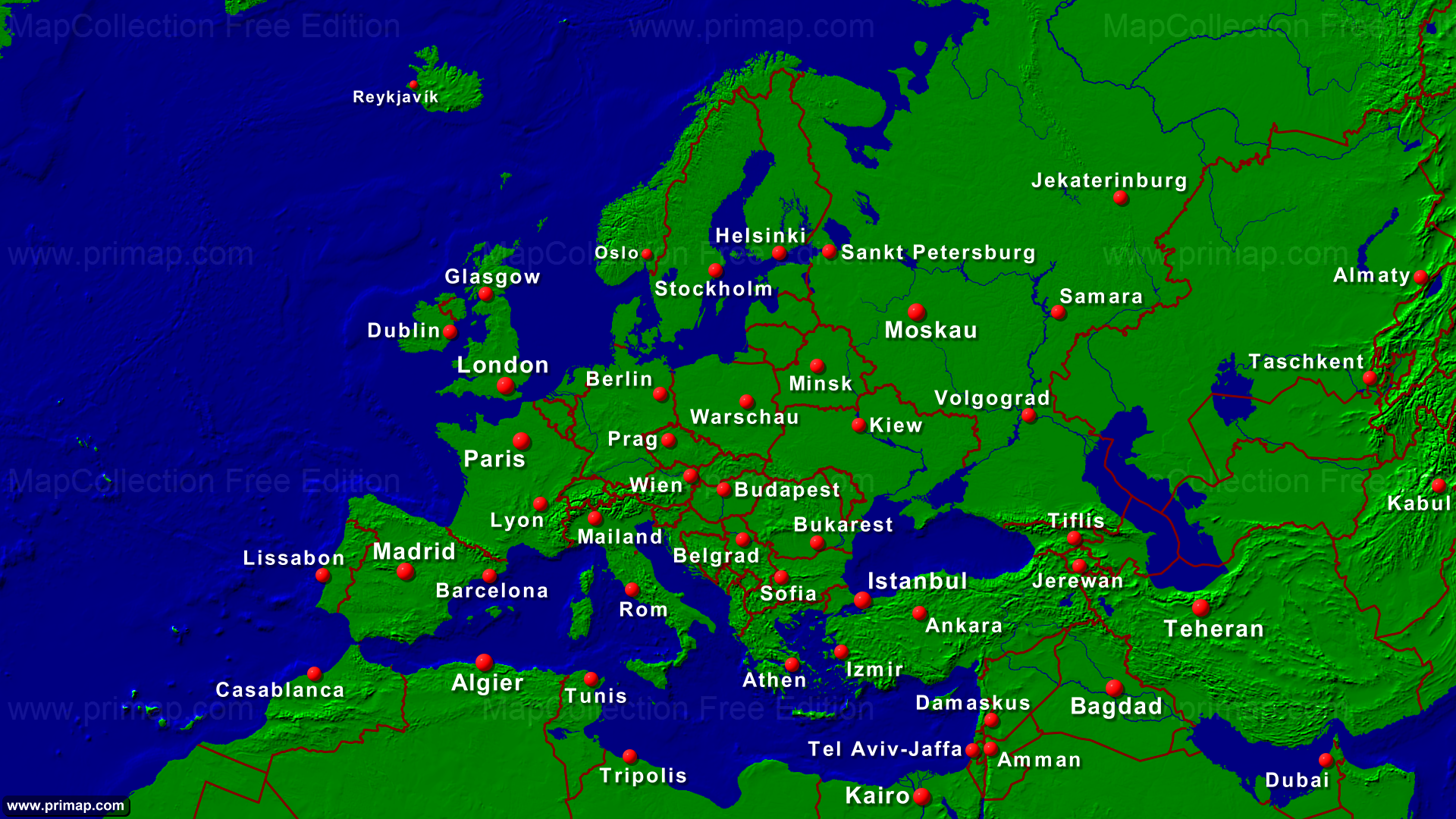 Kontinentalkarten - Europa (Typ 1) - Städte + Grenzen - 1920x1080 (16:9) große Schrift