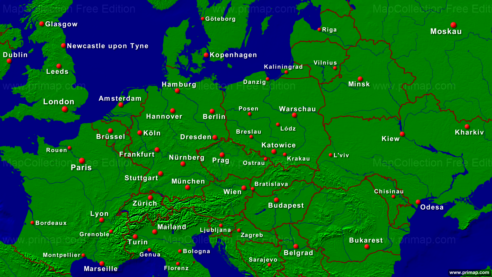 Kontinentalkarten - Europa-Mittel - Städte + Grenzen - 1920x1080 (16:9) große Schrift