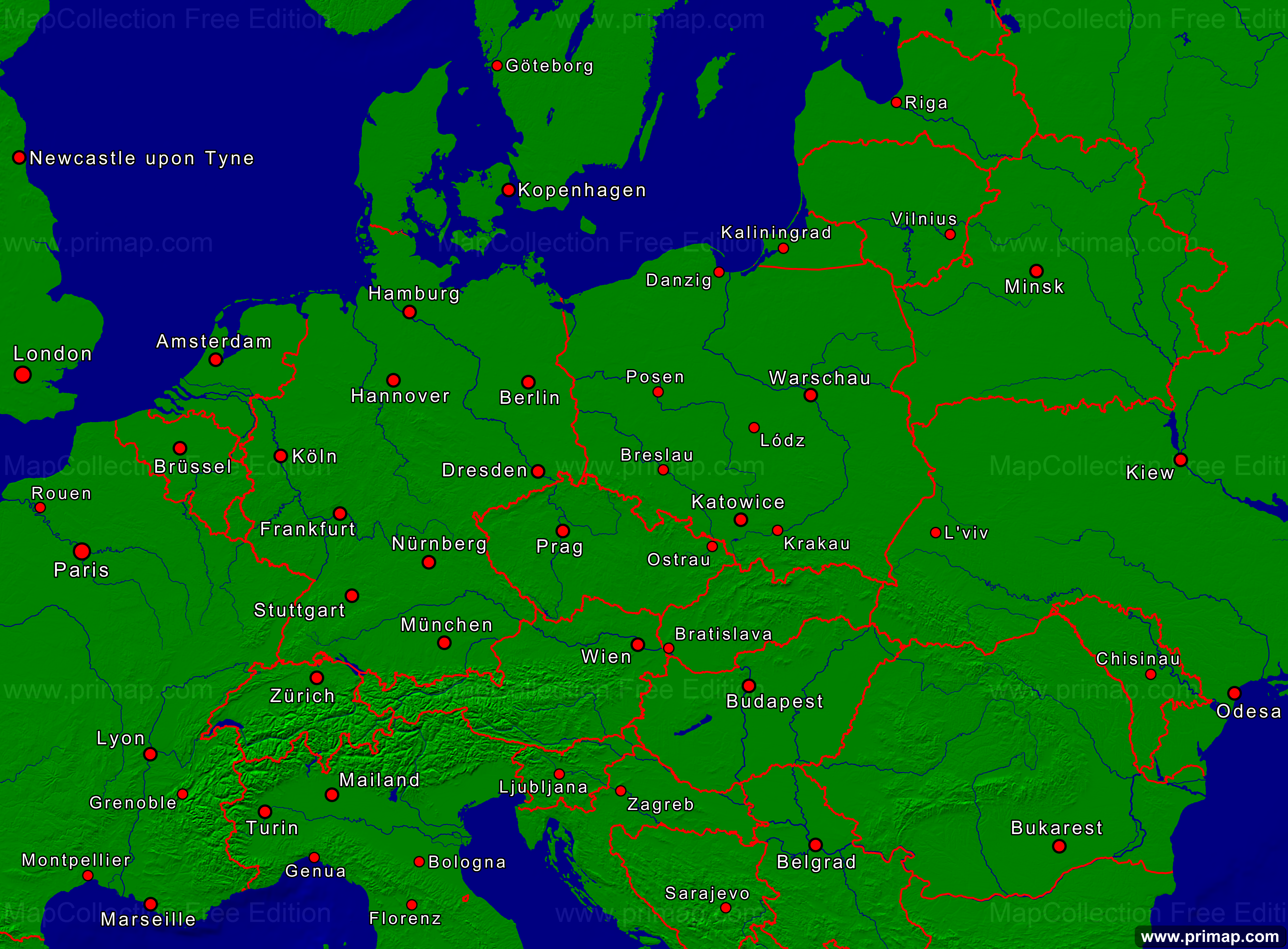 Kontinentalkarten - Europa-Mittel - Städte + Grenzen - 4000x2947 kleine Schrift