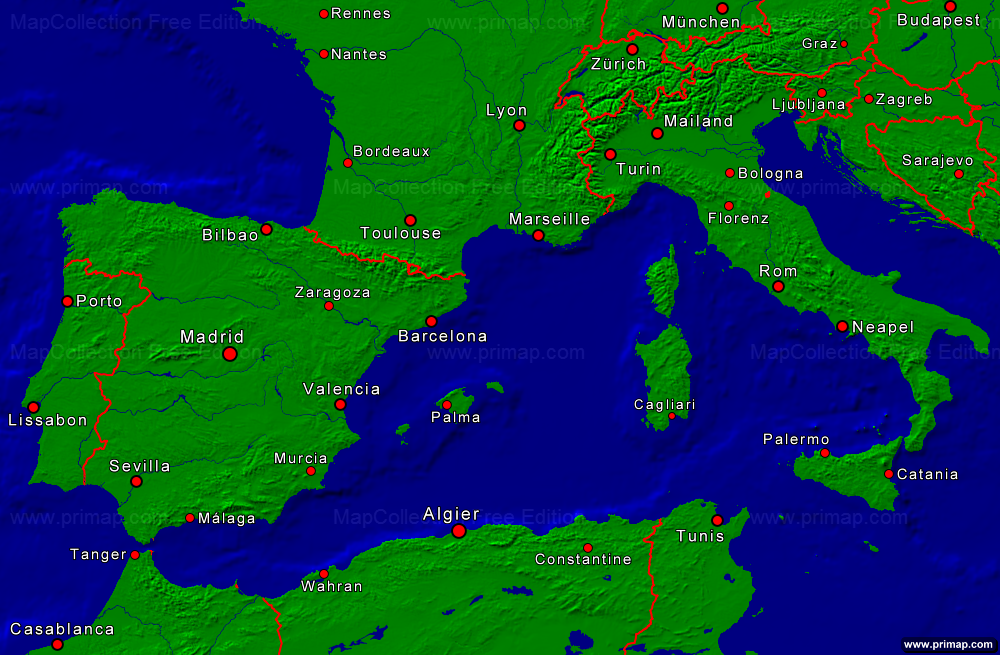 Kontinentalkarten - Europa-Südwest - Städte + Grenzen - 1000x655 kleine Schrift