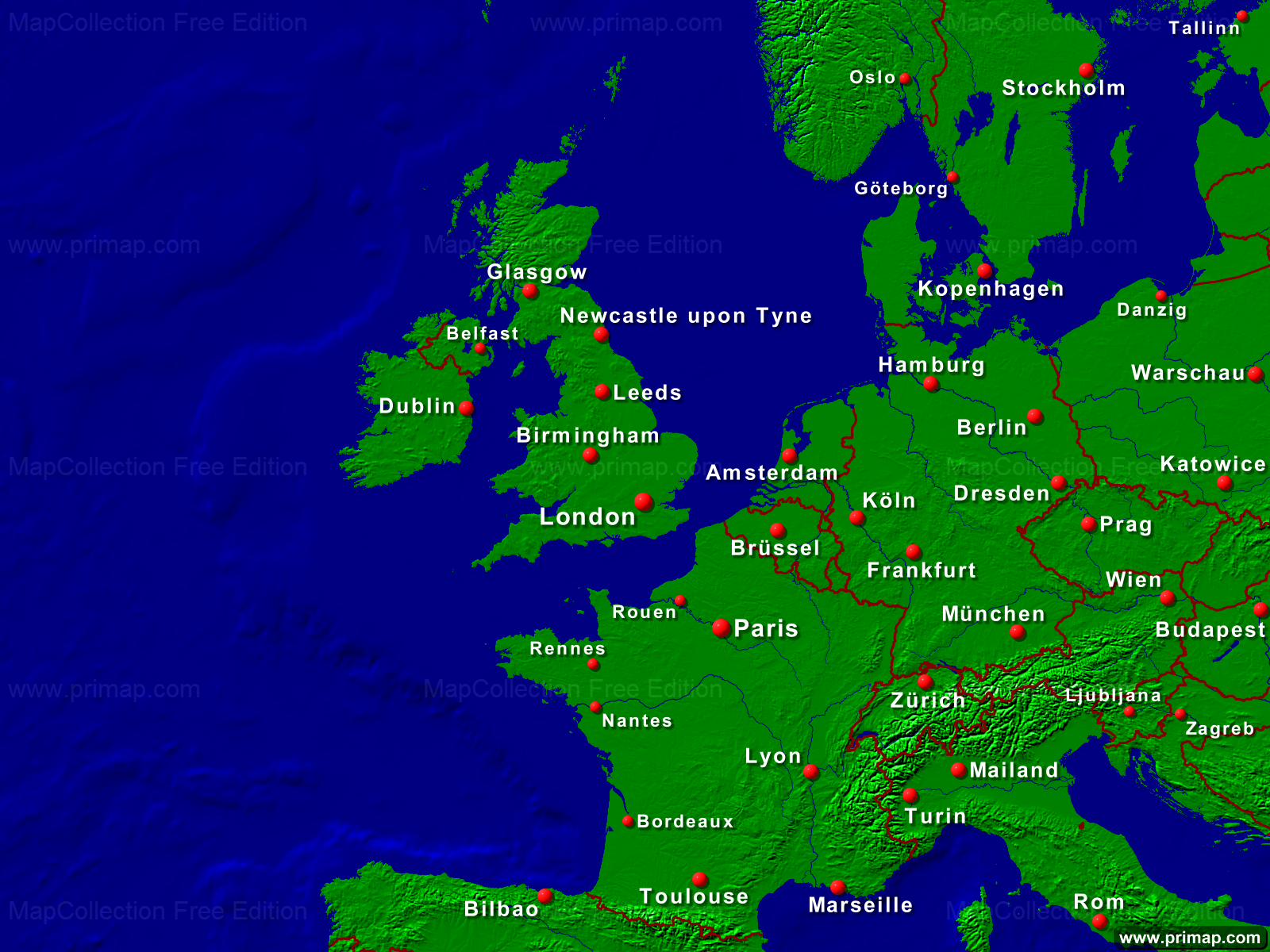 Kontinentalkarten - Europa-West - Städte + Grenzen - 1600x1200 (4:3) große Schrift