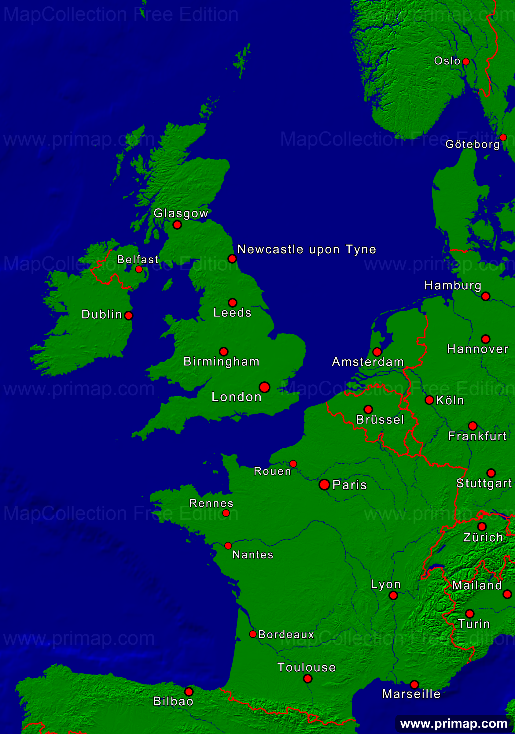 Kontinentalkarten - Europa-West - Städte + Grenzen - 1685x2400 kleine Schrift