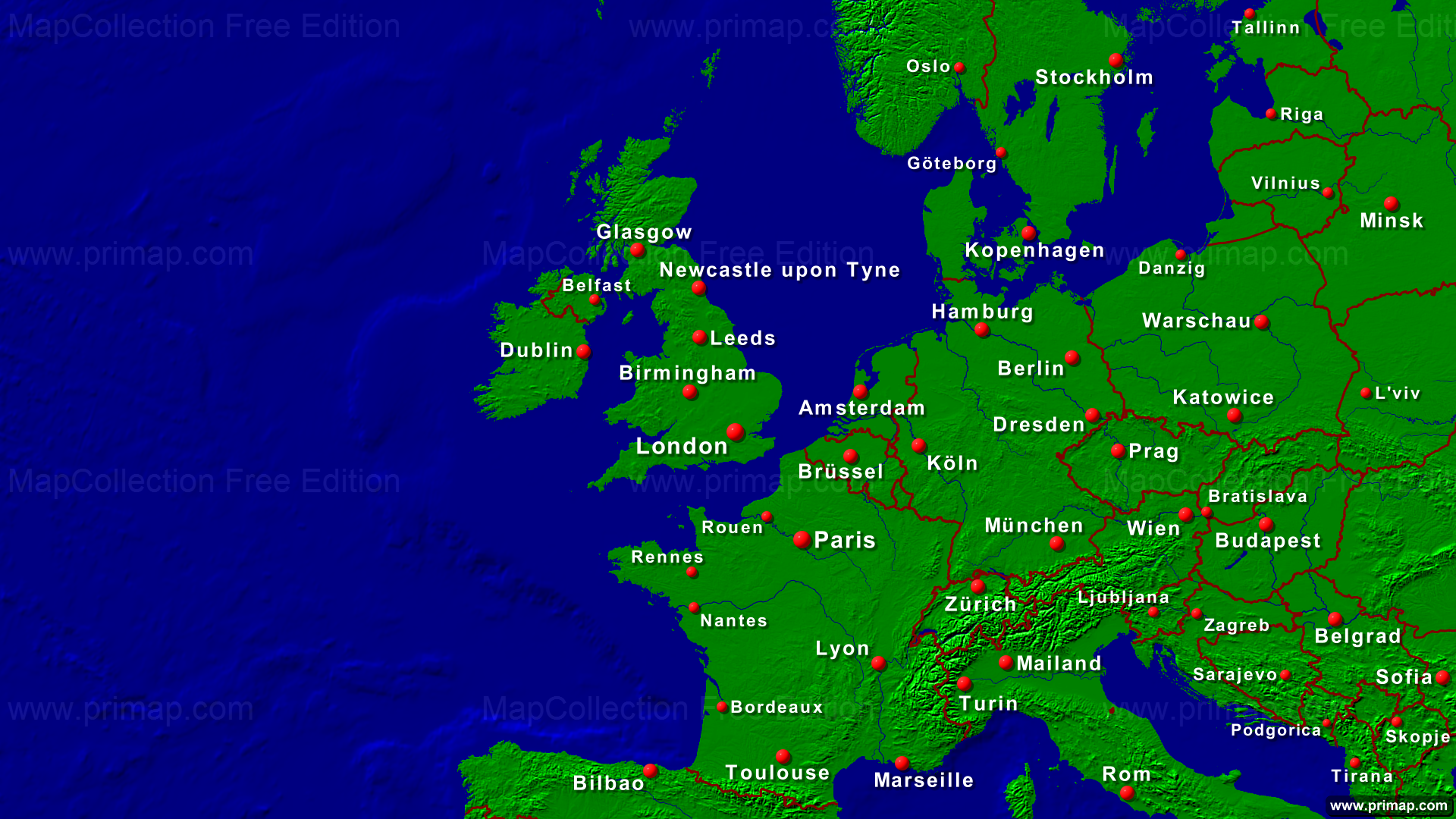 Kontinentalkarten - Europa-West - Städte + Grenzen - 1920x1080 (16:9) große Schrift