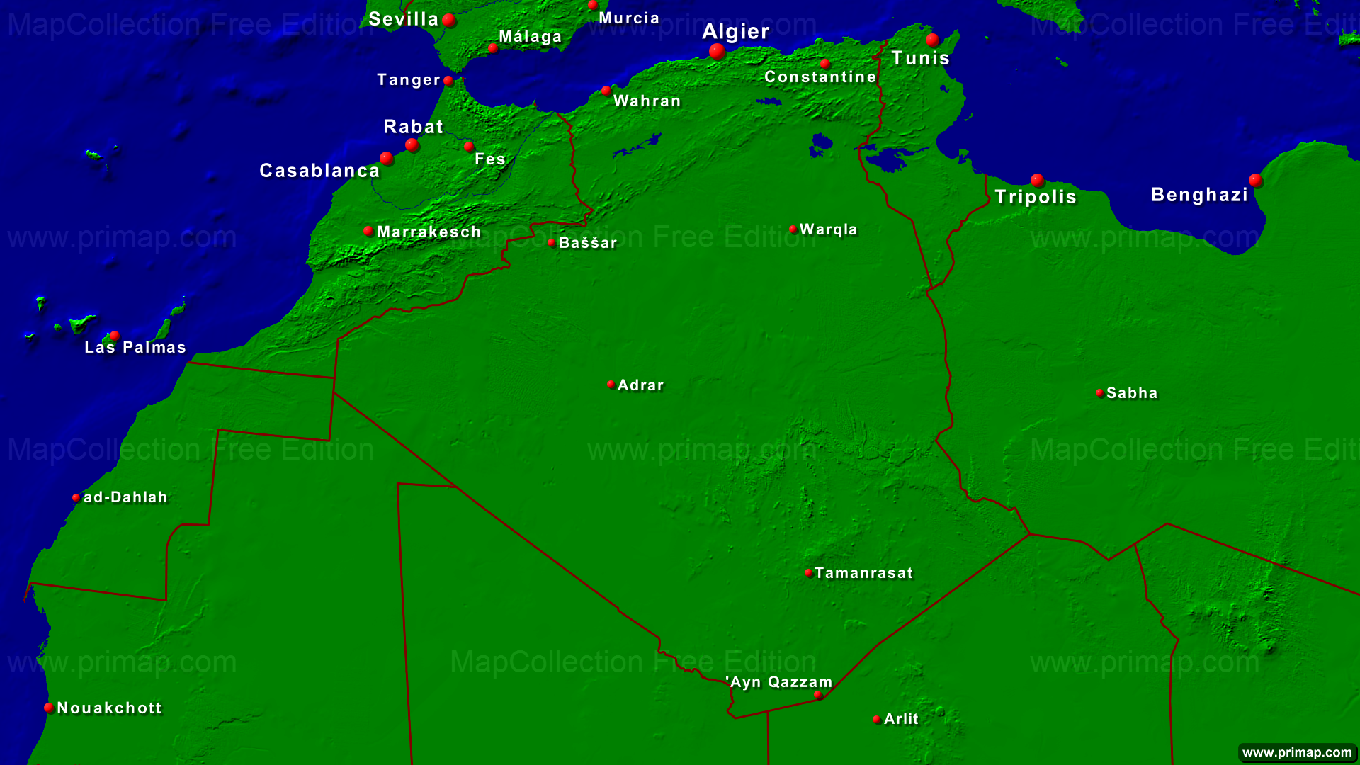 Länderkarten - Algerien - Städte + Grenzen - 1920x1080 (16:9) große Schrift