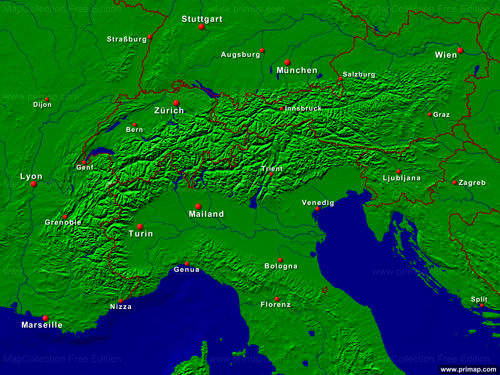 Länderkarten - Alpen - Städte + Grenzen - 1600x1200 (4:3) große Schrift