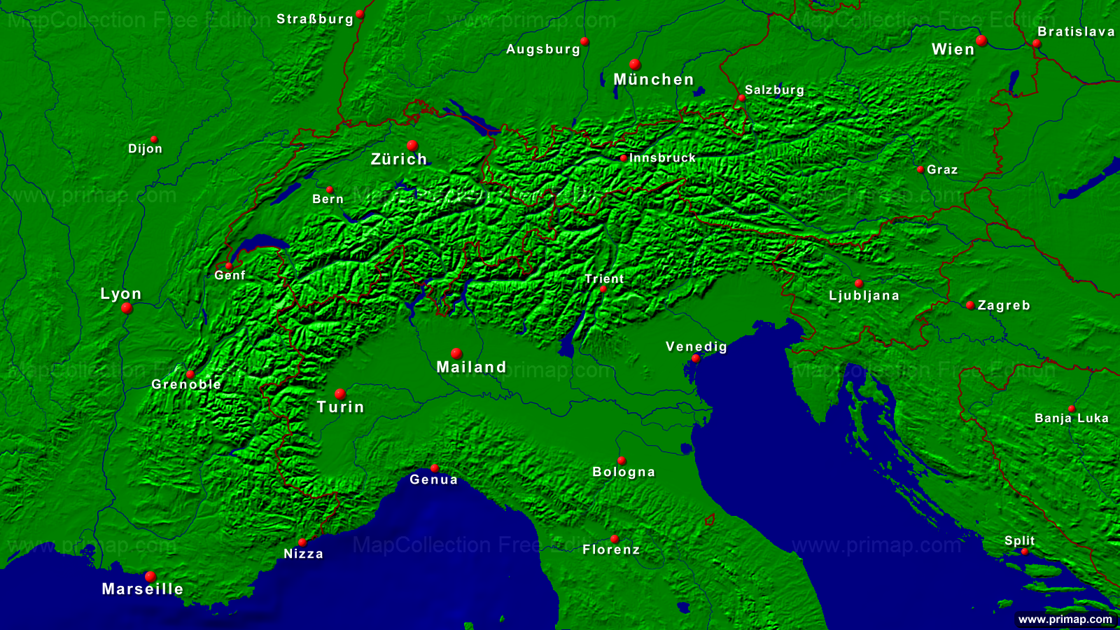 Länderkarten - Alpen - Städte + Grenzen - 1600x900 (16:9) große Schrift