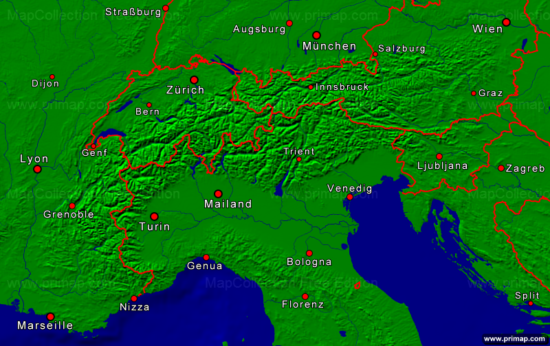 Länderkarten - Alpen - Städte + Grenzen - 800x504 kleine Schrift