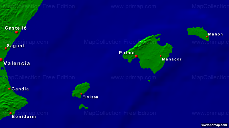 Länderkarten - Balearen - Städte + Grenzen - 800x450 (16:9) große Schrift