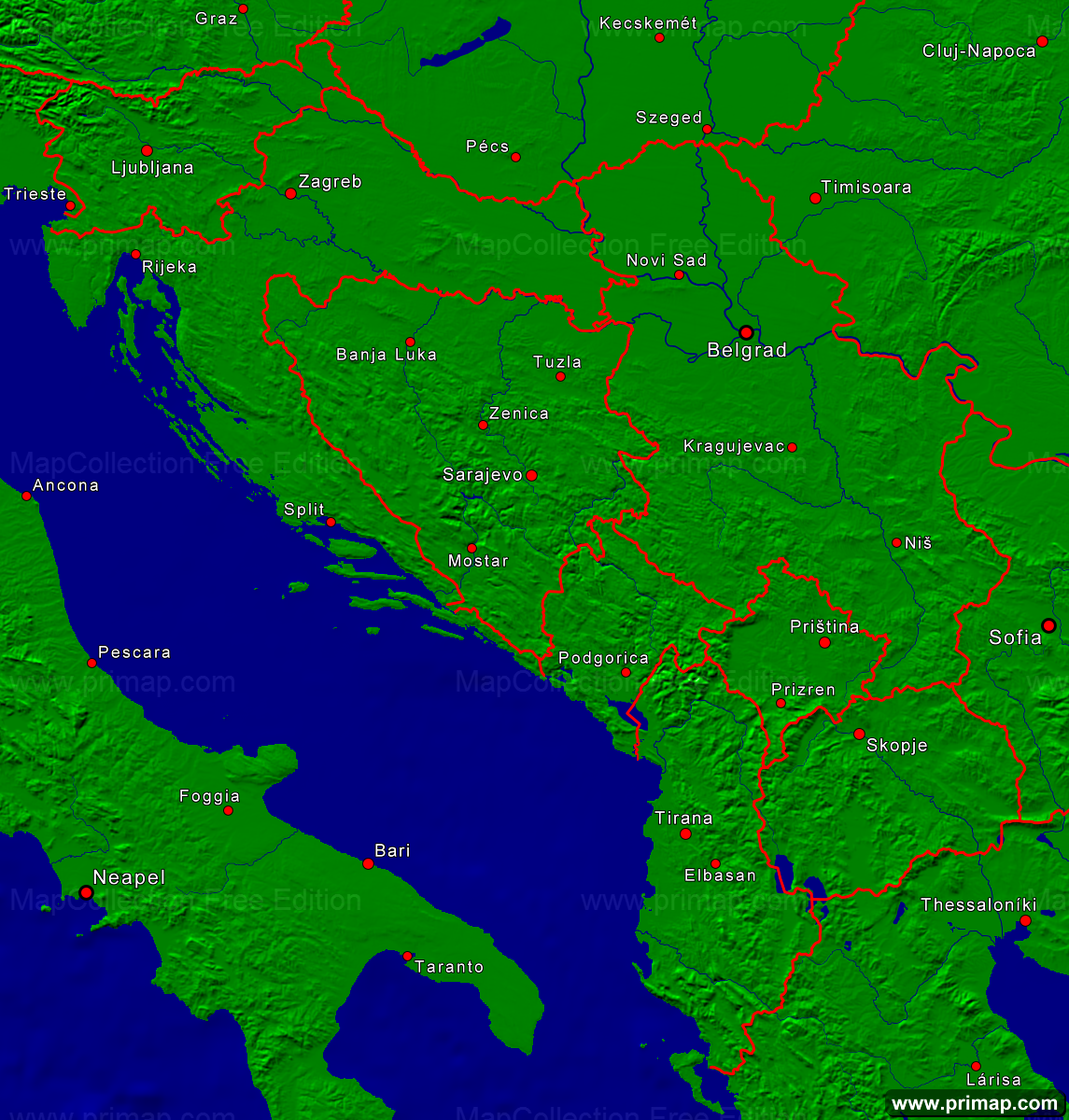 Länderkarten - Balkan - Städte + Grenzen - 1145x1200 kleine Schrift