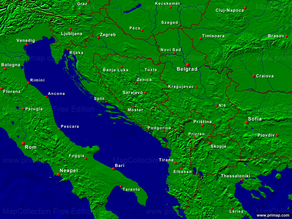Länderkarten - Balkan - Städte + Grenzen - 1200x900 (4:3) große Schrift