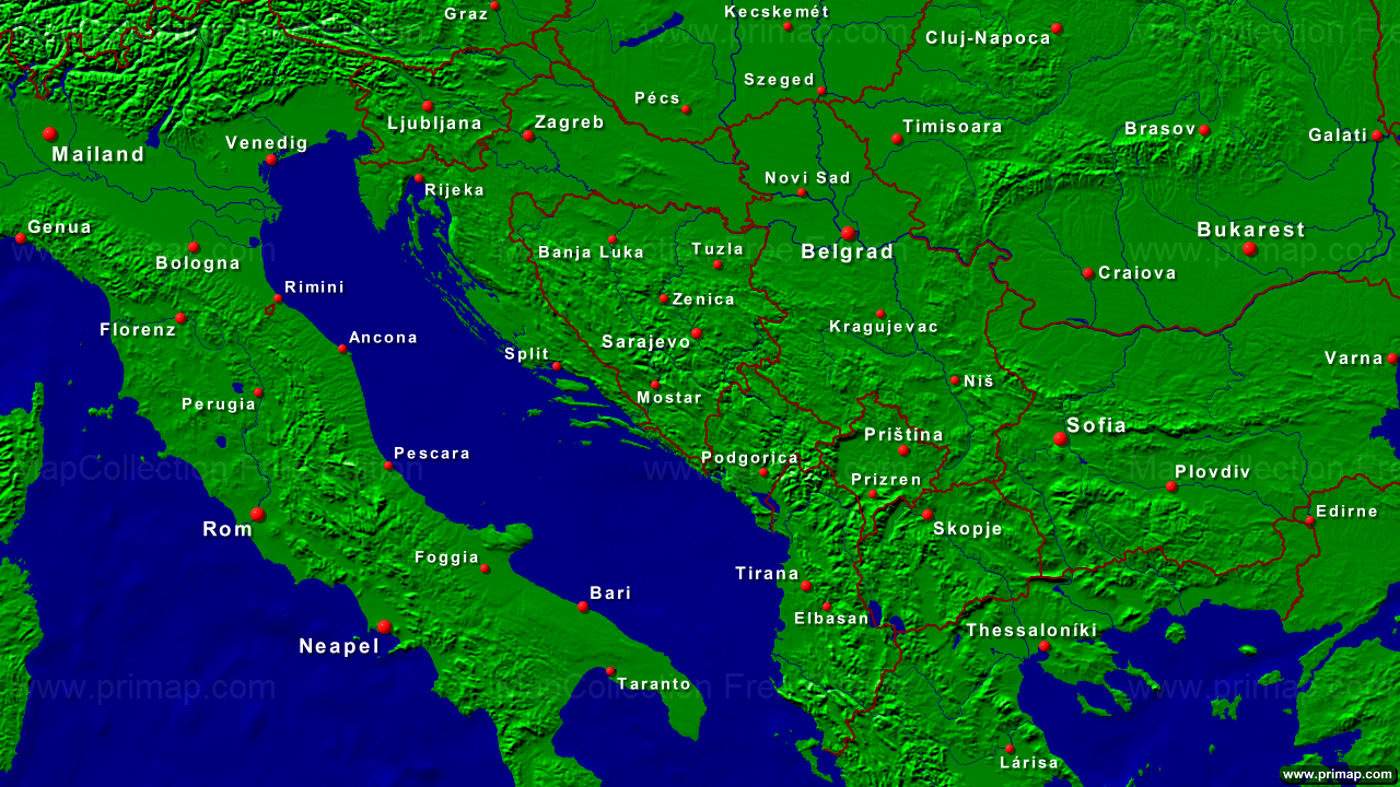 Länderkarten - Balkan - Städte + Grenzen - 1280x720 (16:9) große Schrift