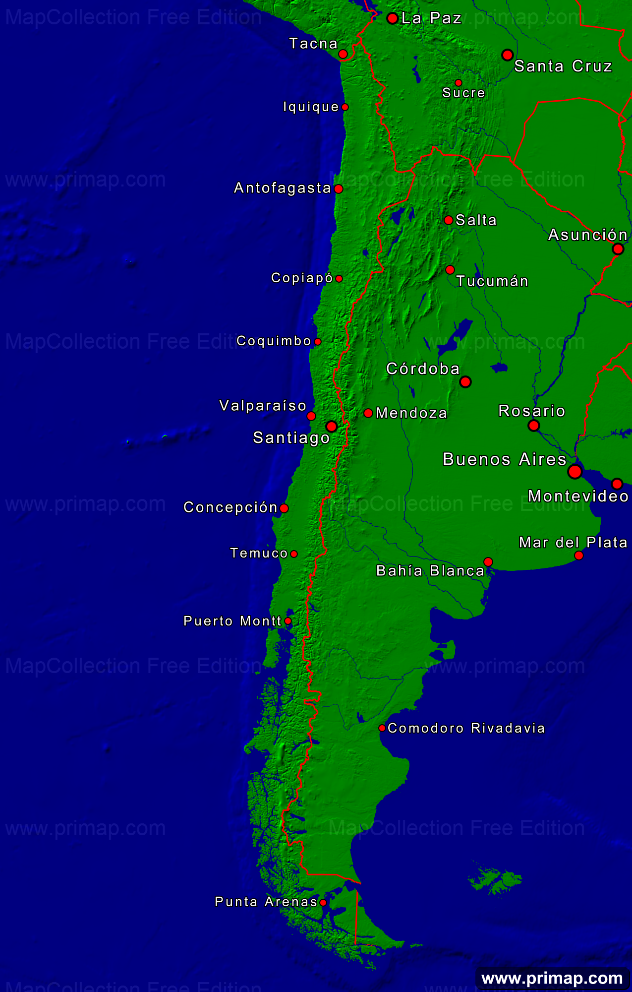 Länderkarten - Chile - Städte + Grenzen - 1275x2000 kleine Schrift