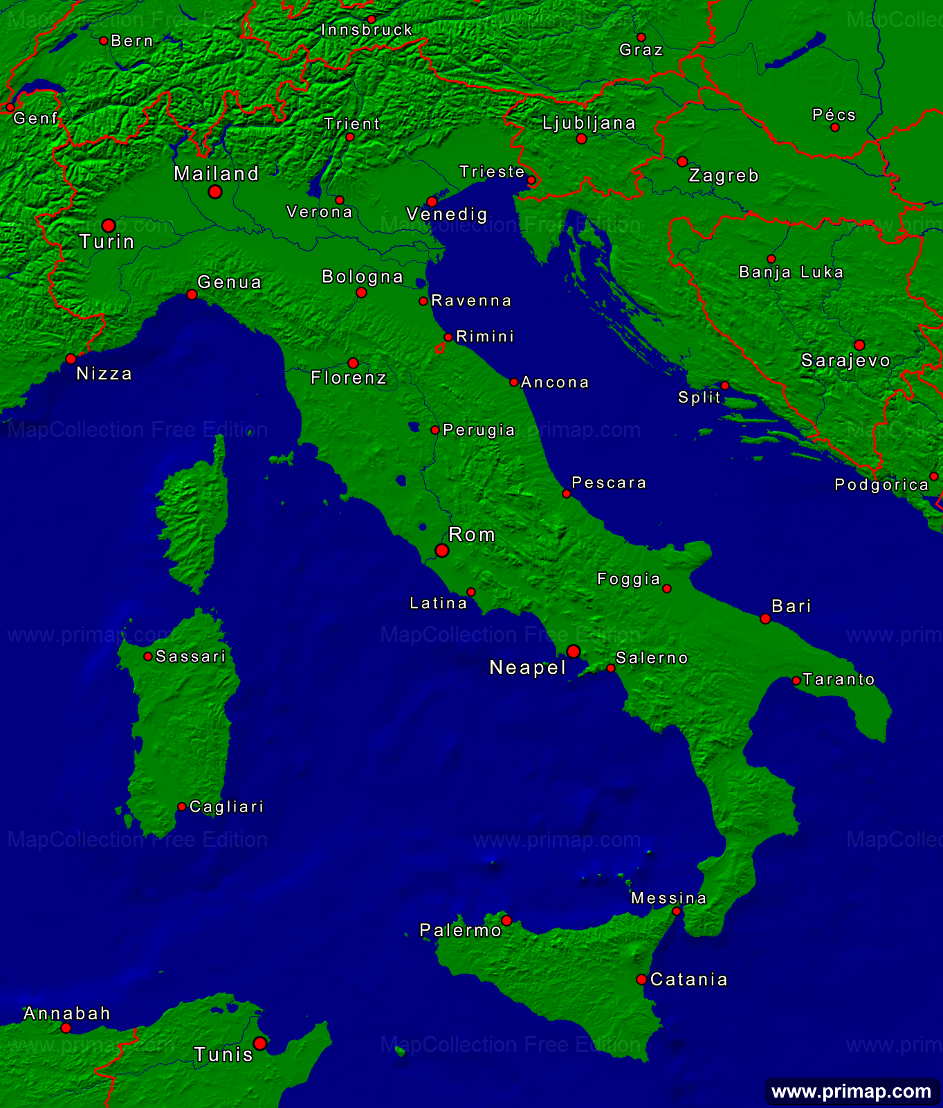 Länderkarten - Italien - Städte + Grenzen - 1363x1600 kleine Schrift