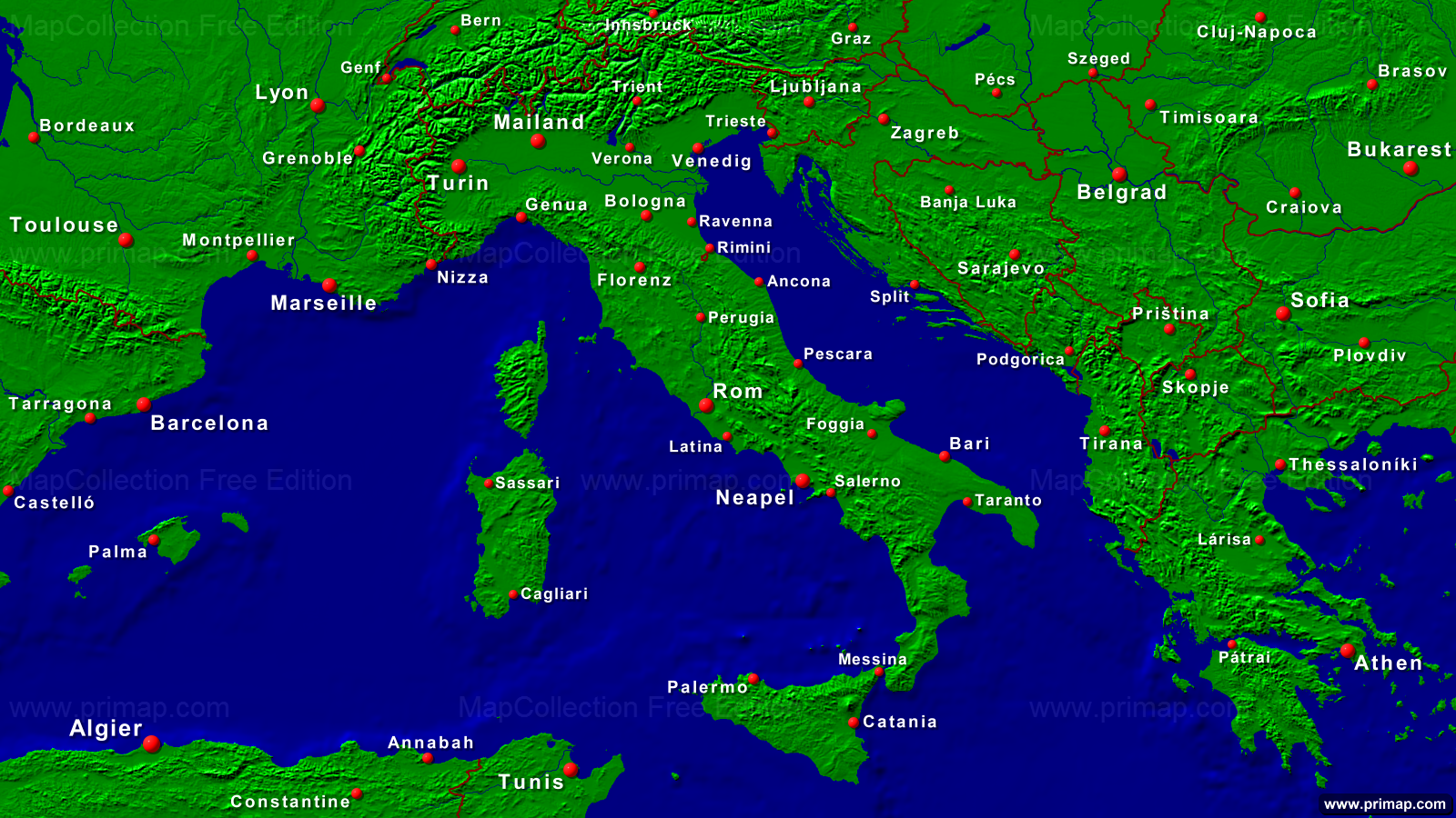Länderkarten - Italien - Städte + Grenzen - 1600x900 (16:9) große Schrift