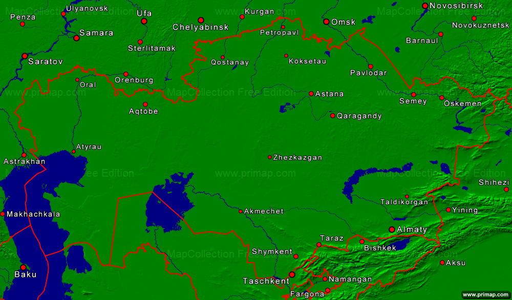 Länderkarten - Kasachstan - Städte + Grenzen - 1000x586 kleine Schrift