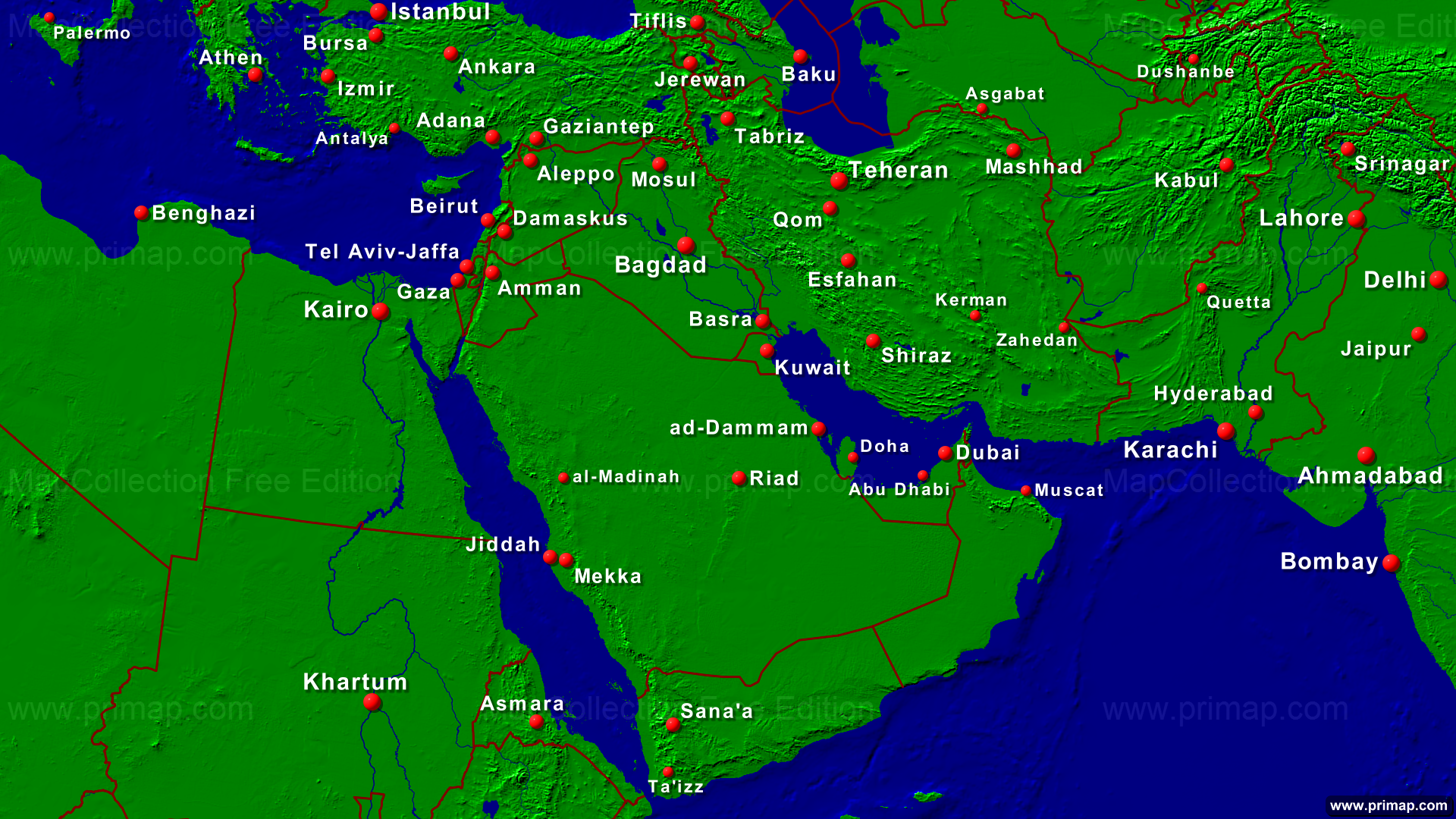 Länderkarten - Naher Osten - Städte + Grenzen - 1920x1080 (16:9) große Schrift