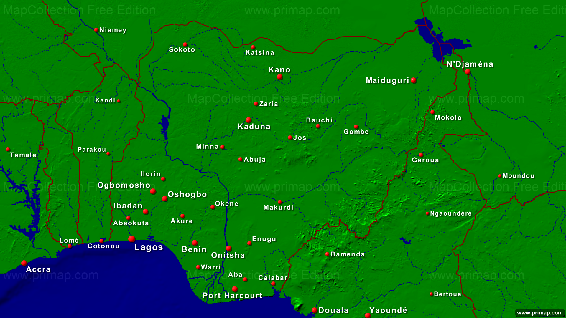 Länderkarten - Nigeria - Städte + Grenzen - 1920x1080 (16:9) große Schrift