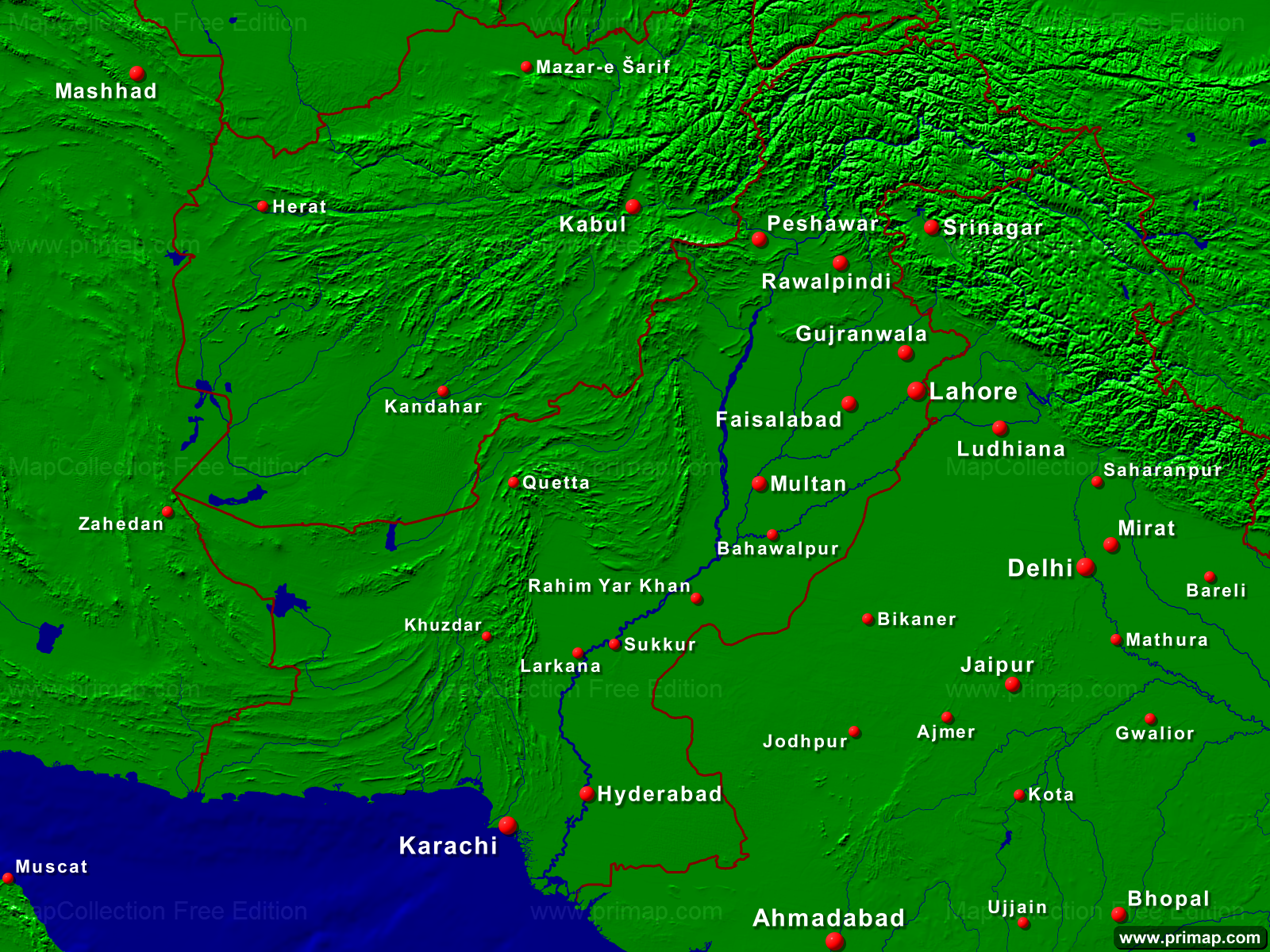 Länderkarten - Pakistan - Städte + Grenzen - 1600x1200 (4:3) große Schrift