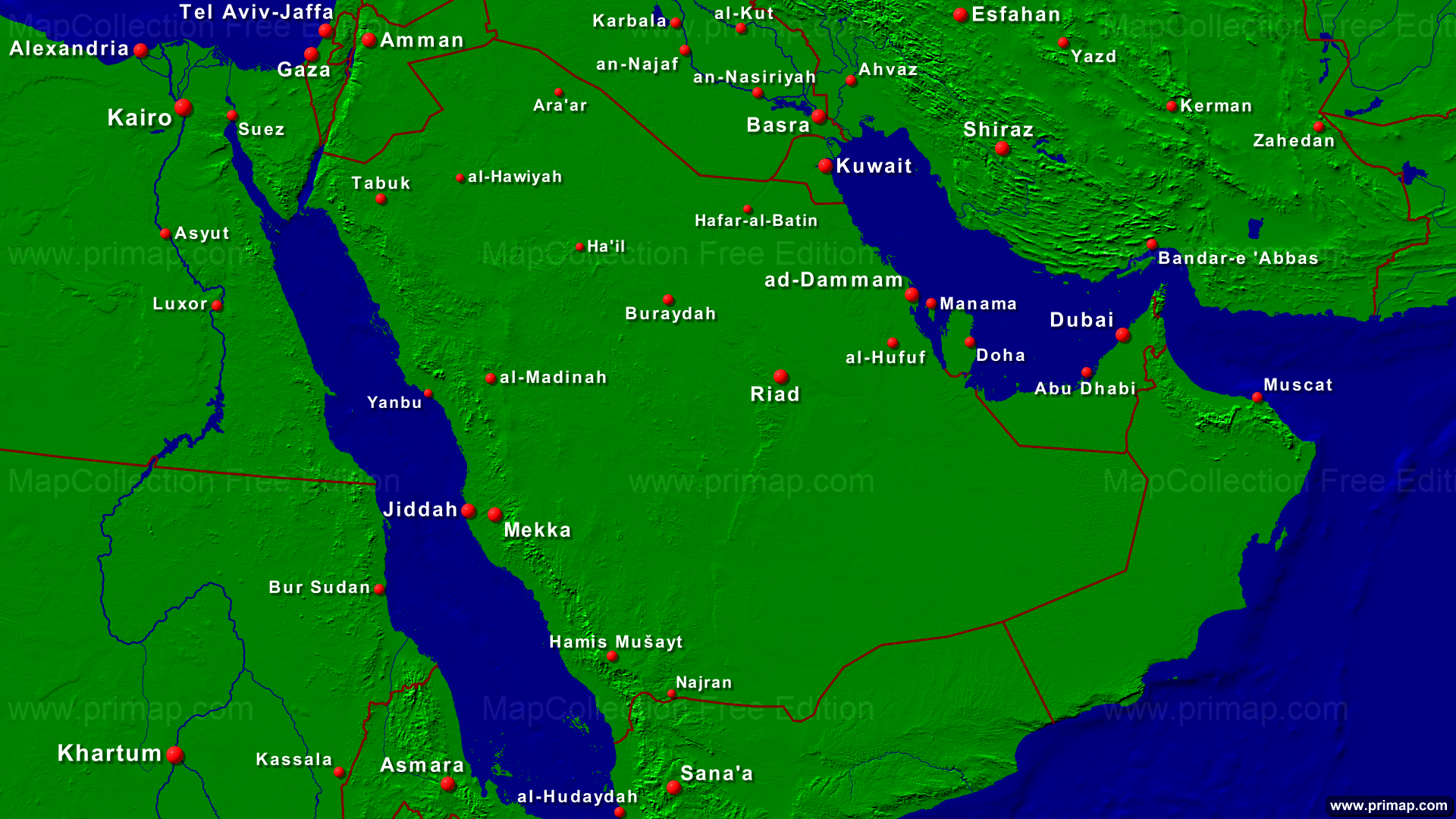 Länderkarten - Saudi-Arabien - Städte + Grenzen - 1920x1080 (16:9) große Schrift