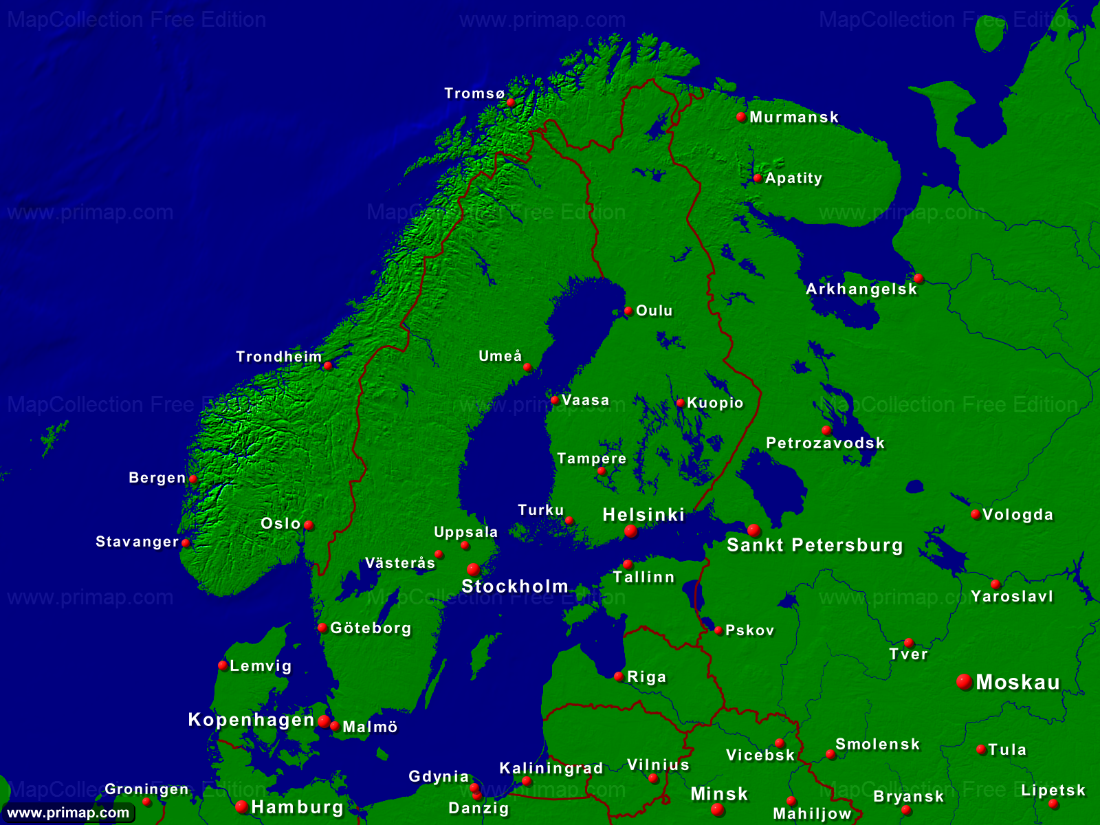 Länderkarten - Skandinavien - Städte + Grenzen - 1600x1200 (4:3) große Schrift