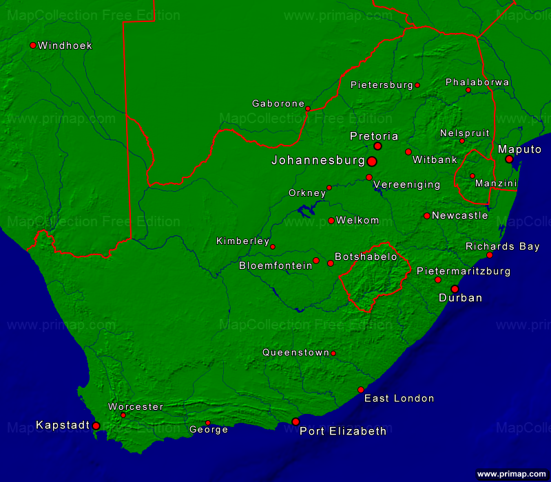 Länderkarten - Südafrika - Städte + Grenzen - 800x701 kleine Schrift