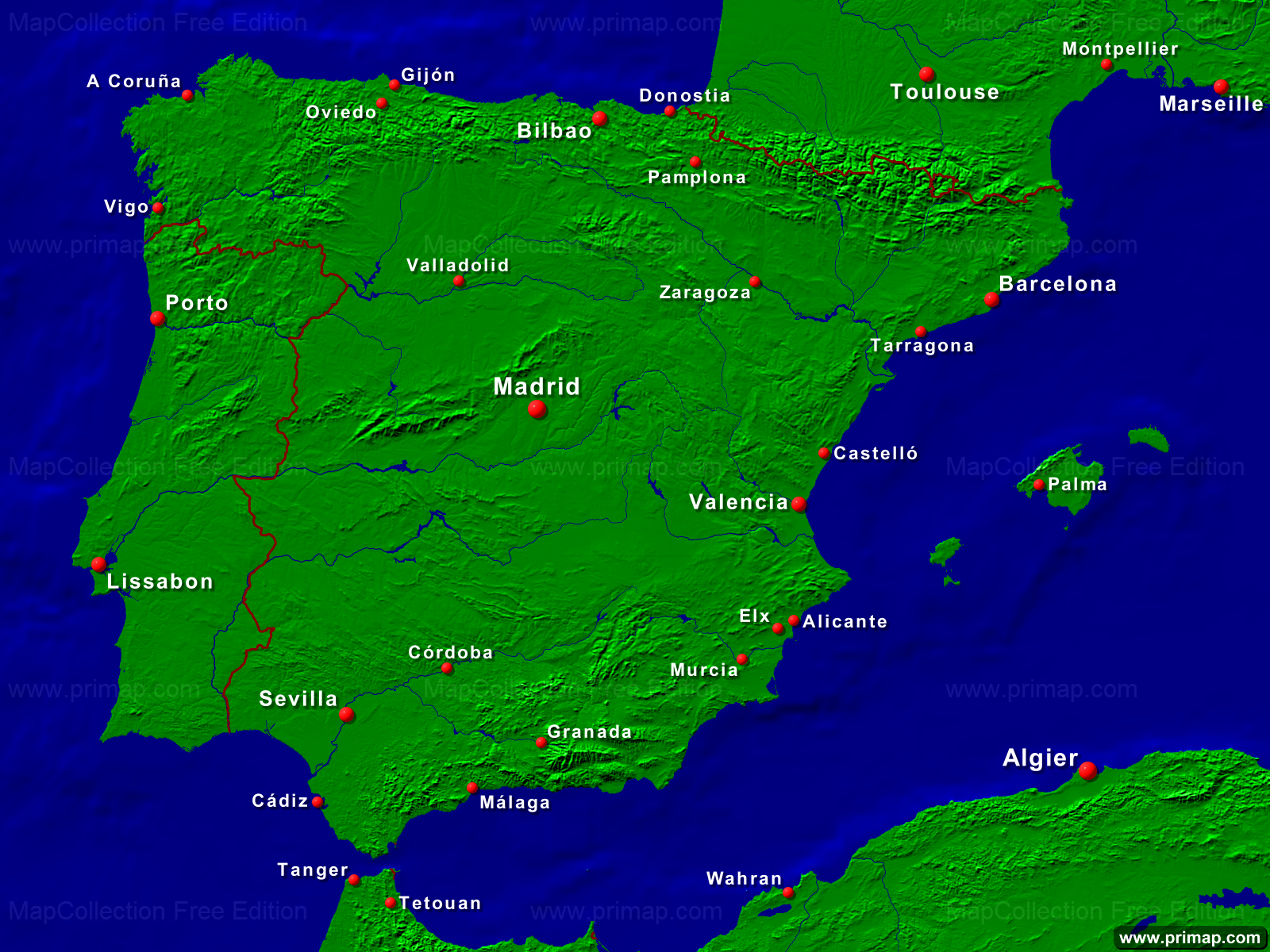 Länderkarten - Spanien - Städte + Grenzen - 1600x1200 (4:3) große Schrift