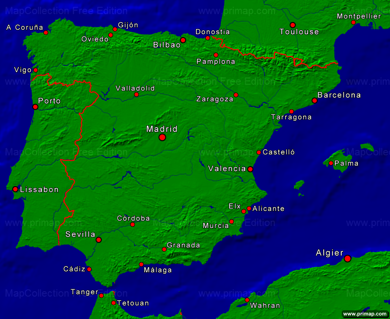 Länderkarten - Spanien - Städte + Grenzen - 800x655 kleine Schrift