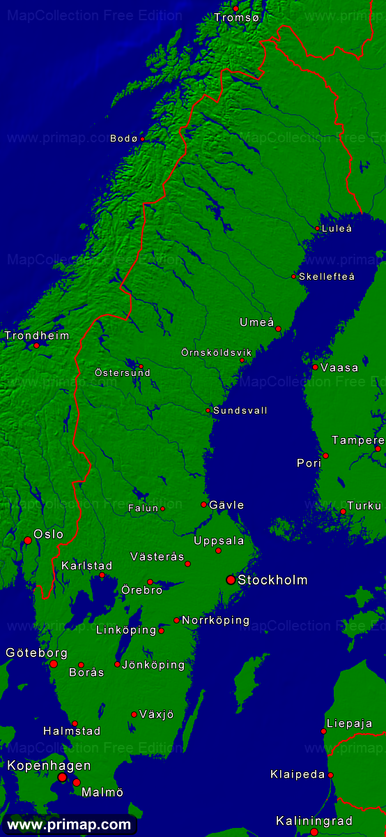 Länderkarten - Schweden - Städte + Grenzen - 554x1200 kleine Schrift