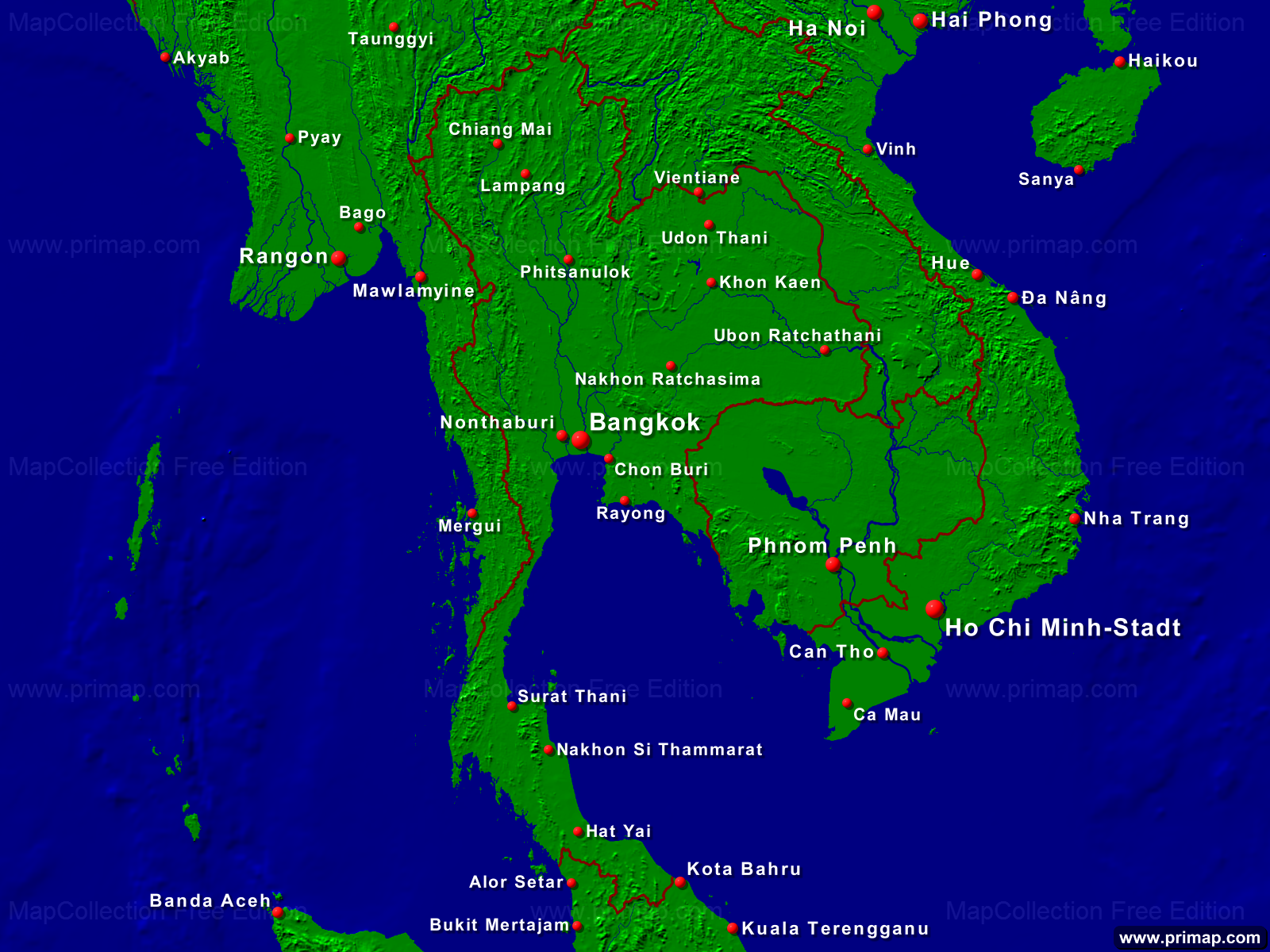 Länderkarten - Thailand - Städte + Grenzen - 1600x1200 (4:3) große Schrift