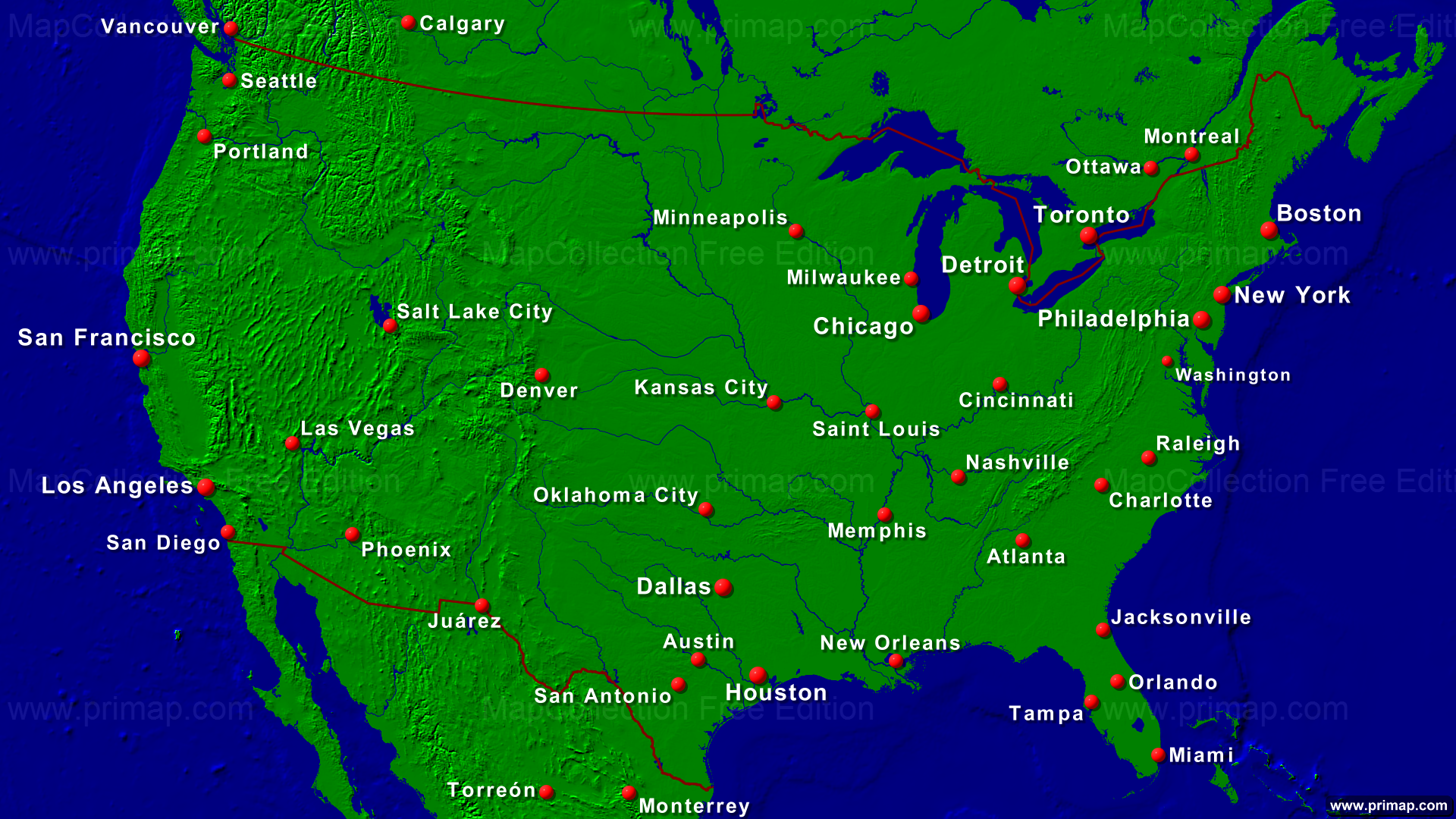 Länderkarten - USA - Städte + Grenzen - 1920x1080 (16:9) große Schrift