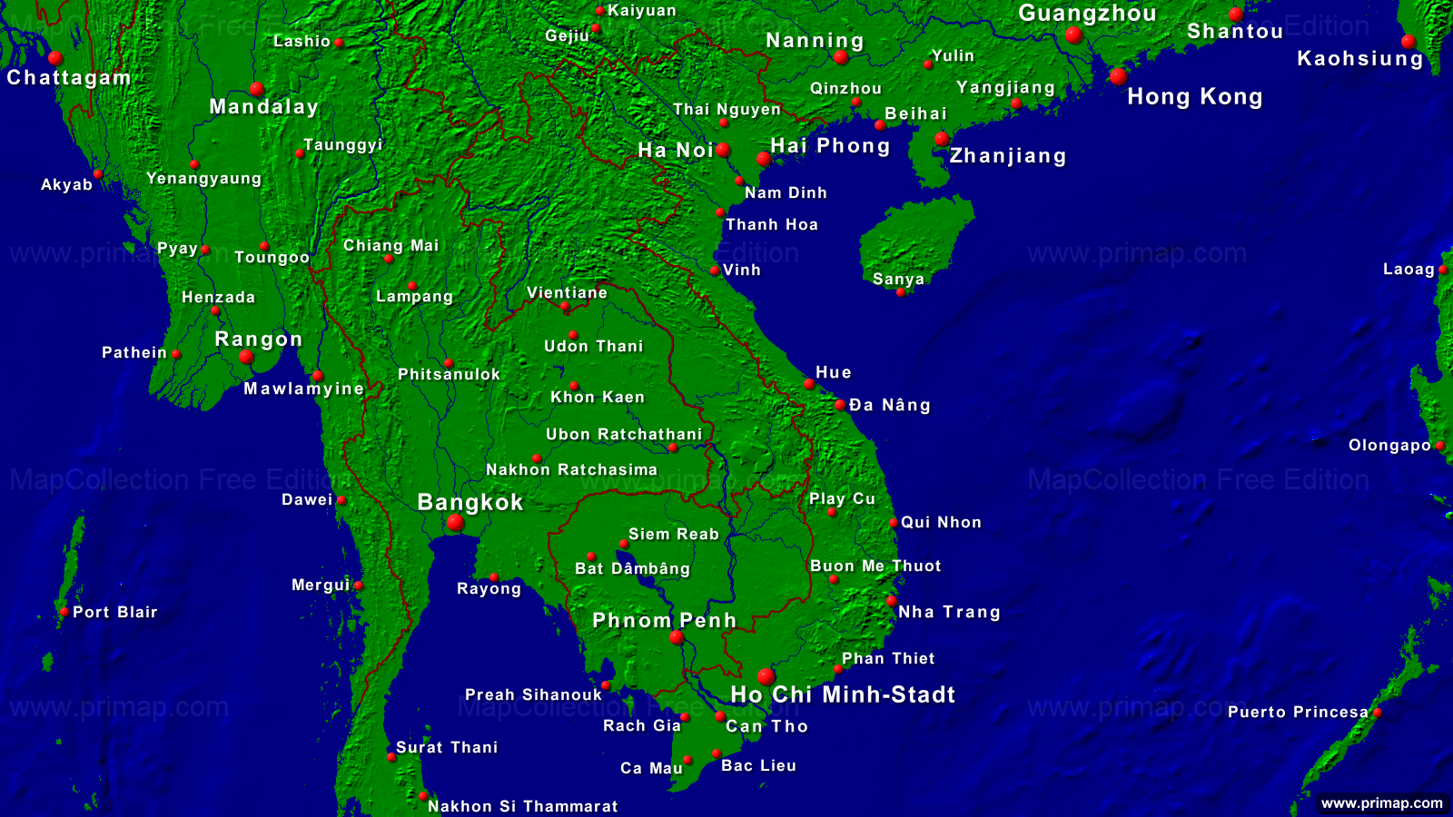 Länderkarten - Vietnam - Städte + Grenzen - 1600x900 (16:9) große Schrift