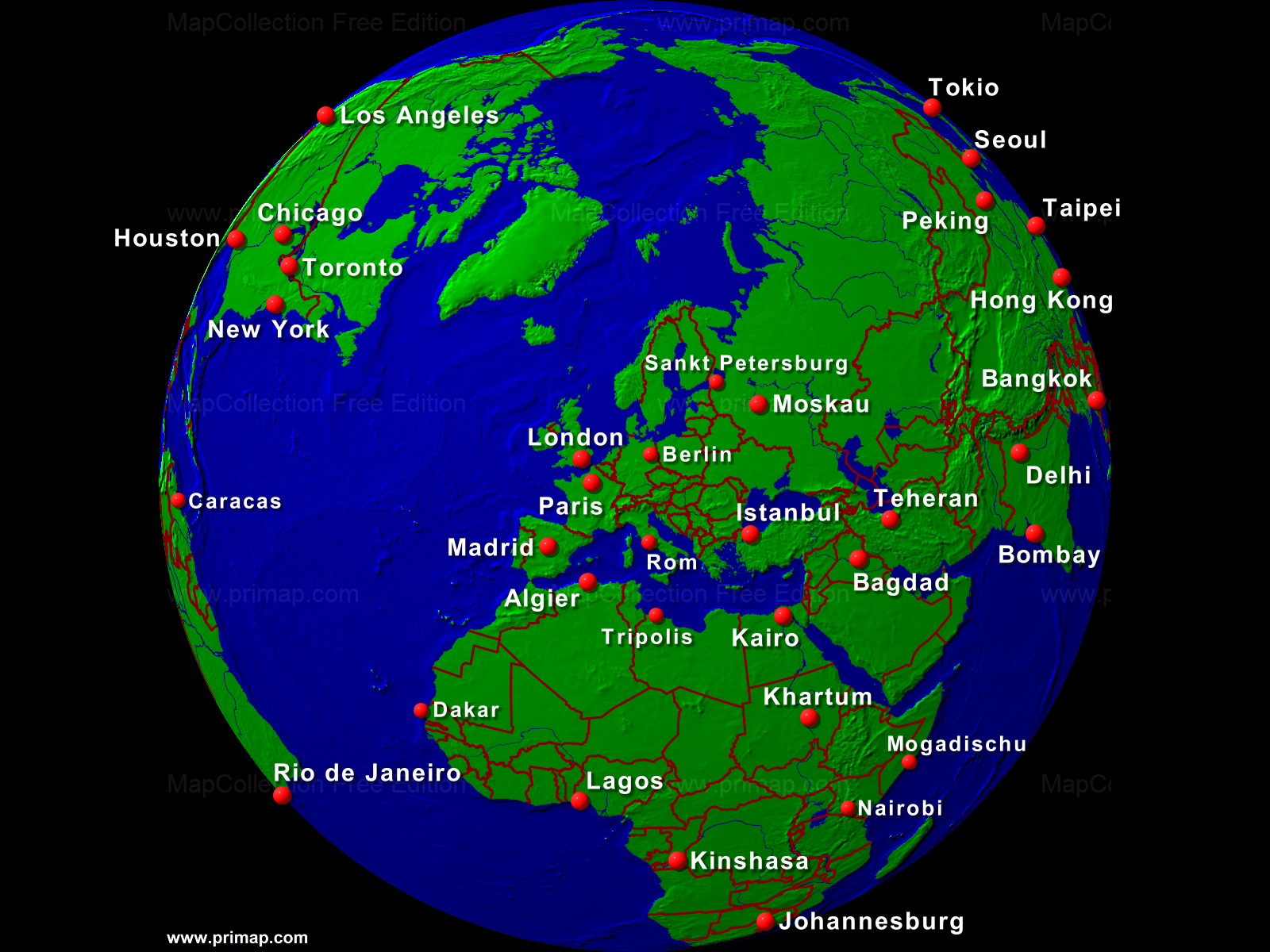 Weltkarten - Globus (Europa-zentriert) - Städte + Grenzen - 1600x1200 (4:3) große Schrift