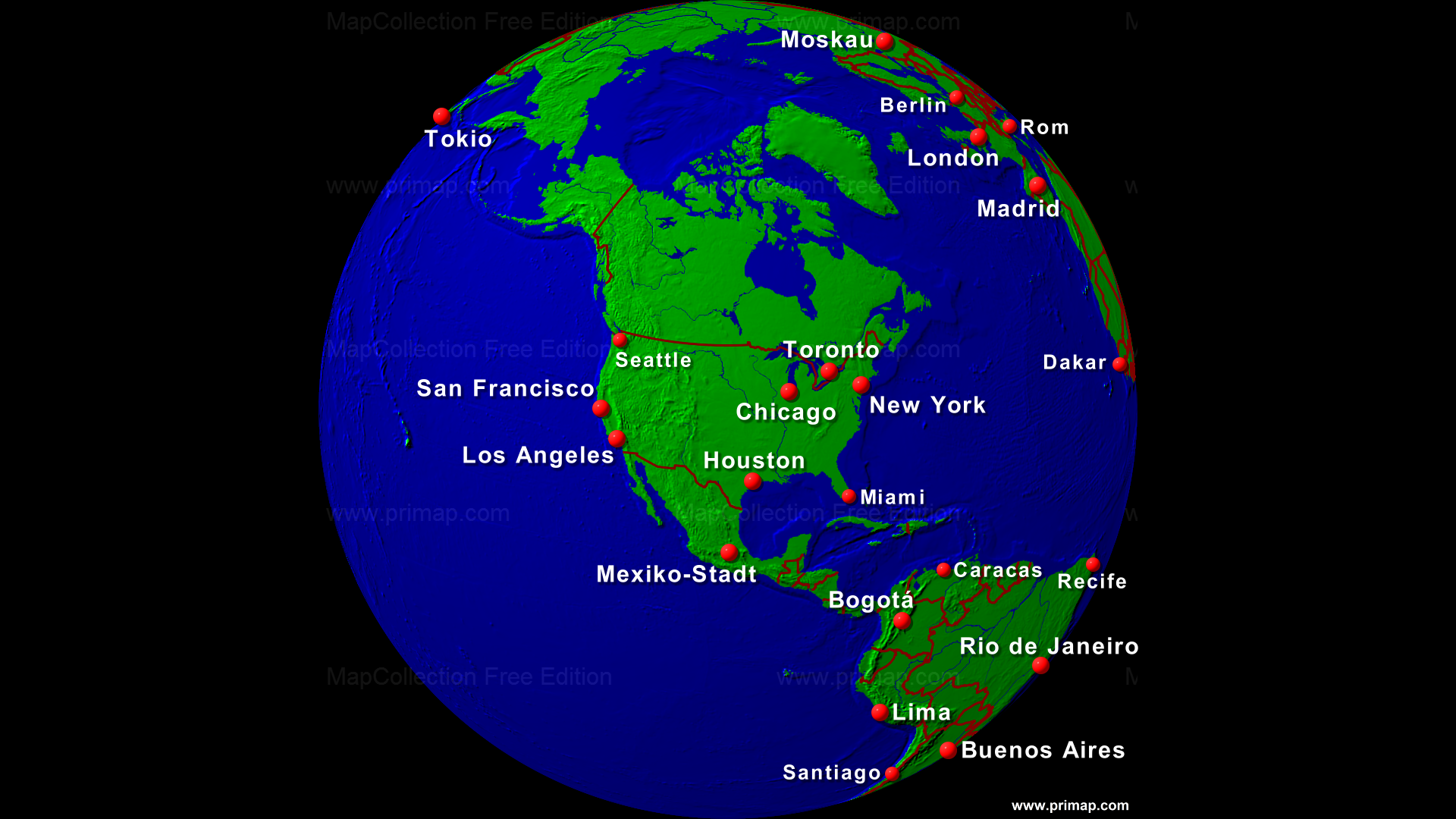 Weltkarten - Globus (USA-zentriert) - Städte + Grenzen - 1920x1080 (16:9) große Schrift