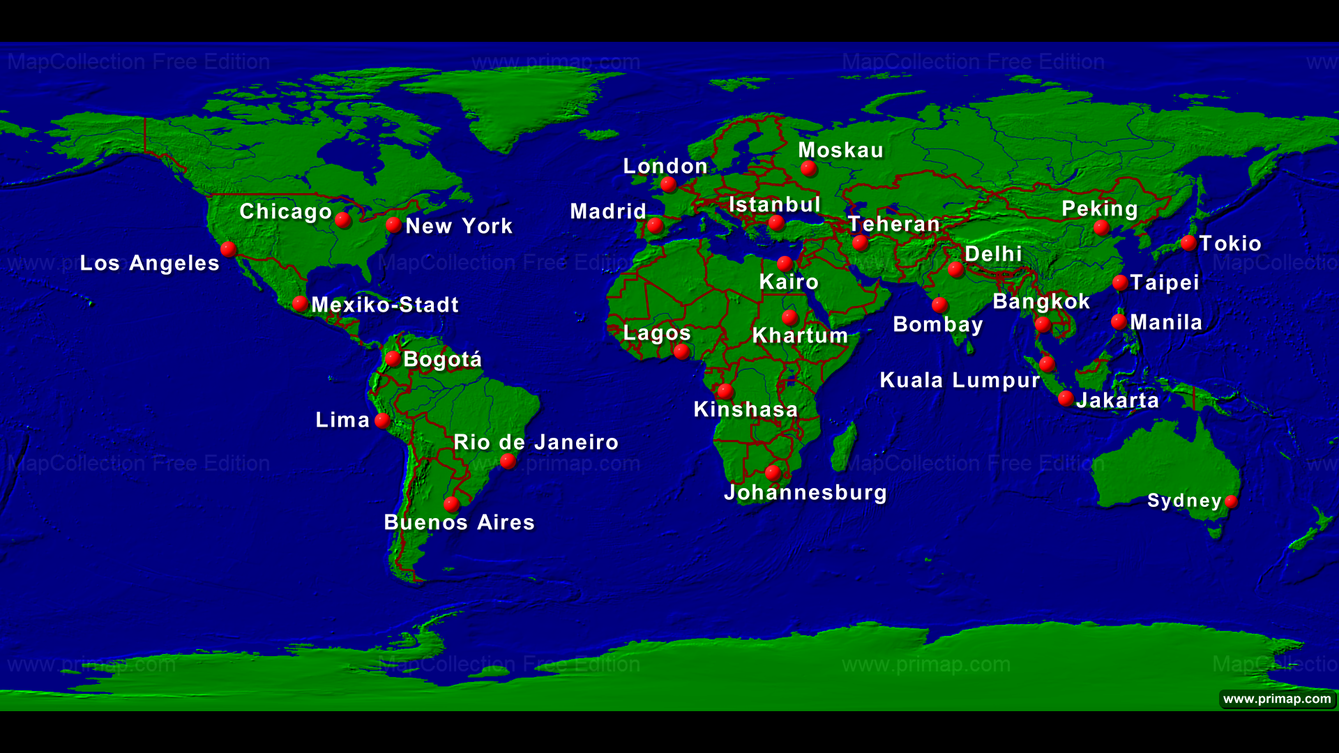 Weltkarten - Welt (Typ 1) - Städte + Grenzen - 1920x1080 (16:9) große Schrift