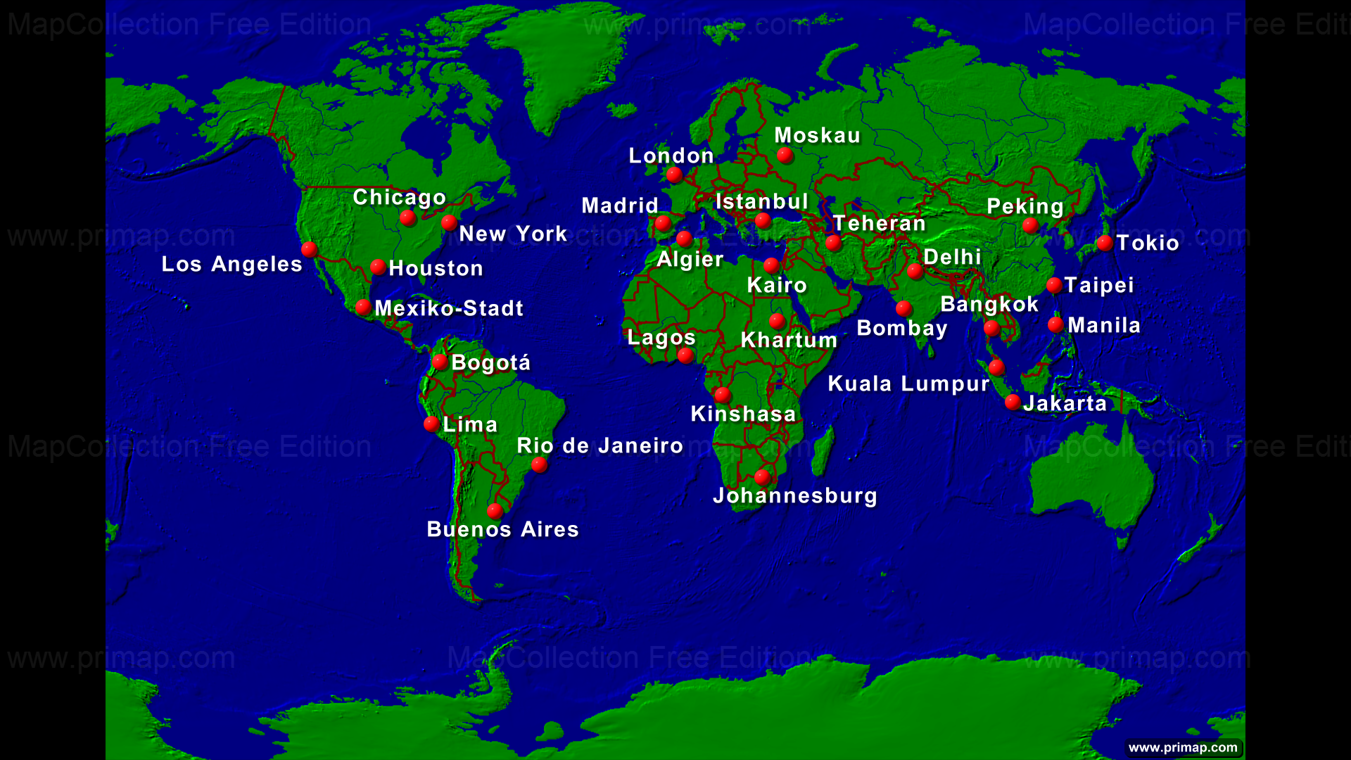 Weltkarten - Welt (Typ 3) - Städte + Grenzen - 1920x1080 (16:9) große Schrift