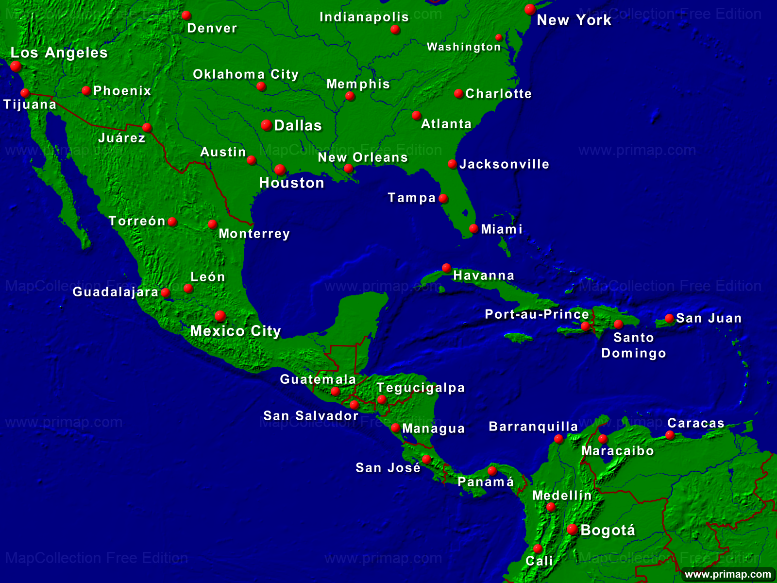 Continental maps - America-Central - Towns + Borders - 1600x1200 (4:3) large Font