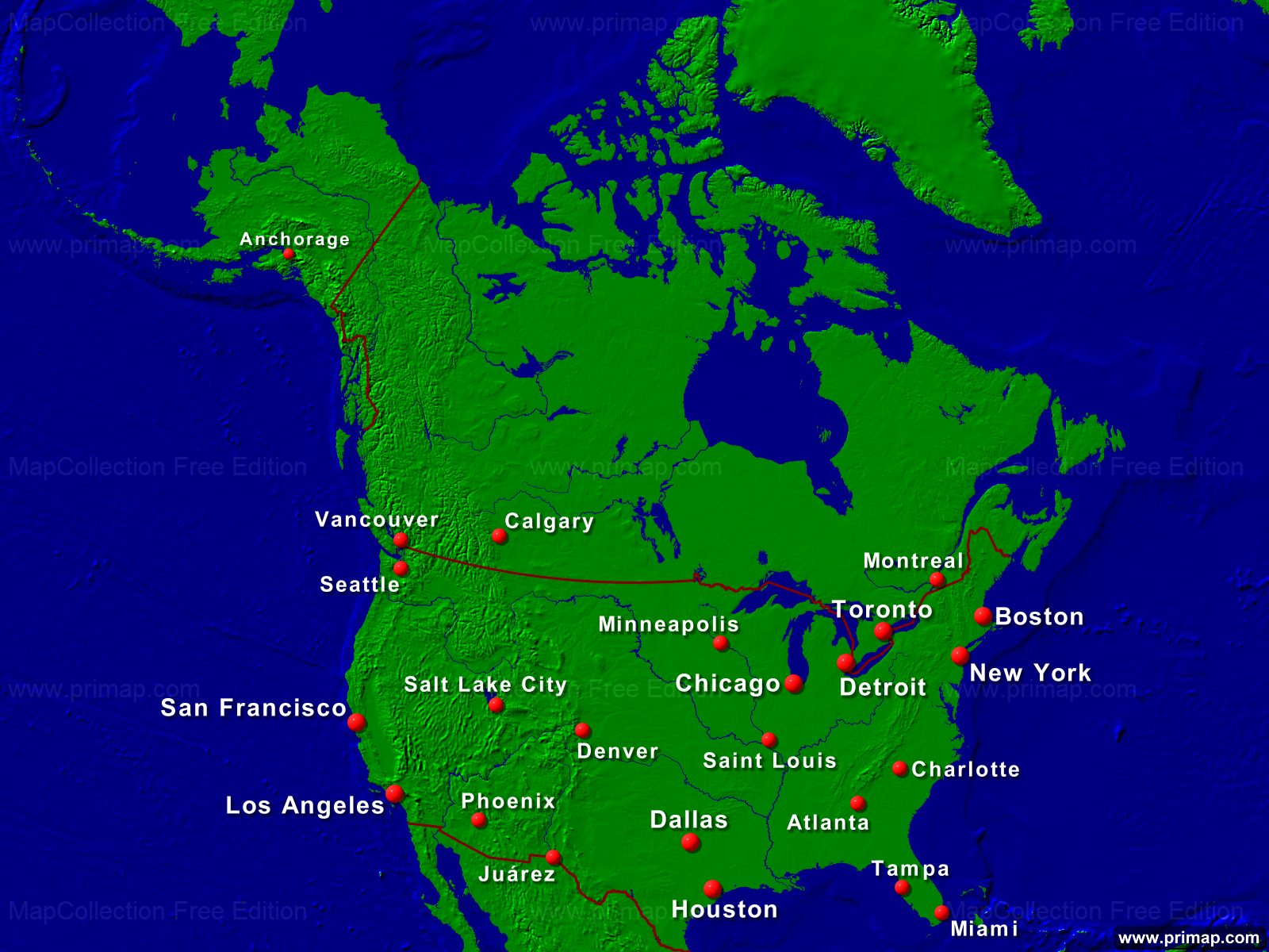 Continental maps - America-North - Towns + Borders - 1600x1200 (4:3) large Font