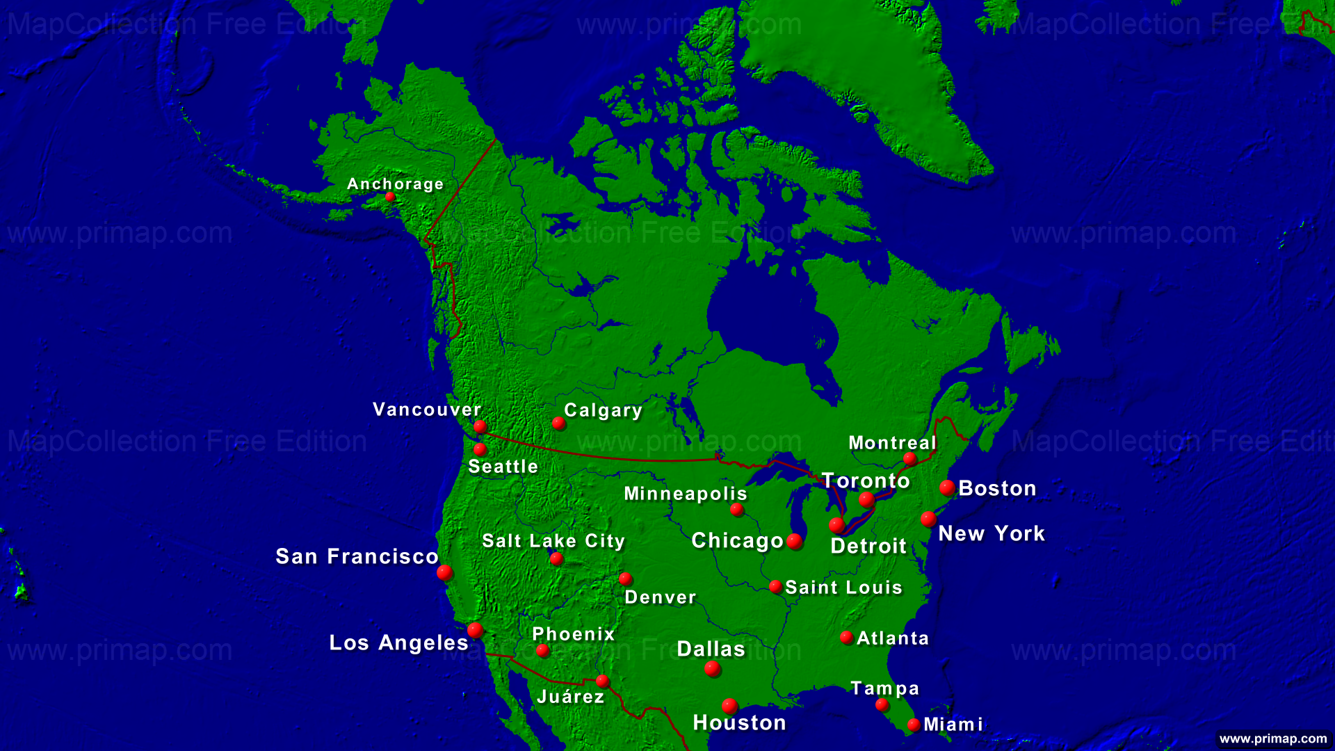 Continental maps - America-North - Towns + Borders - 1920x1080 (16:9) large Font