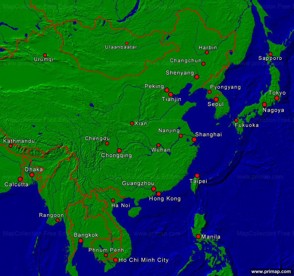 Continental maps - Asia-East - Towns + Borders - 1000x939 small Font