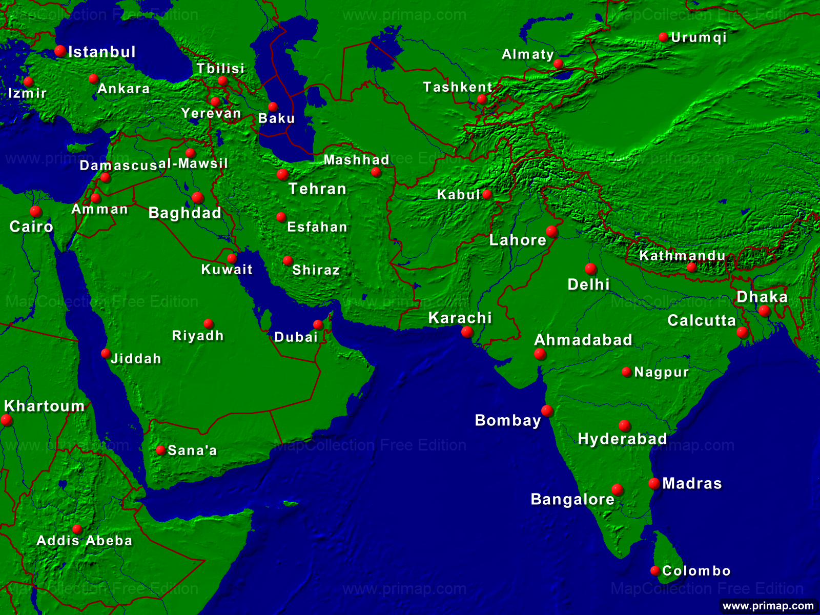 Continental maps - Asia-Southwest - Towns + Borders - 1600x1200 (4:3) large Font